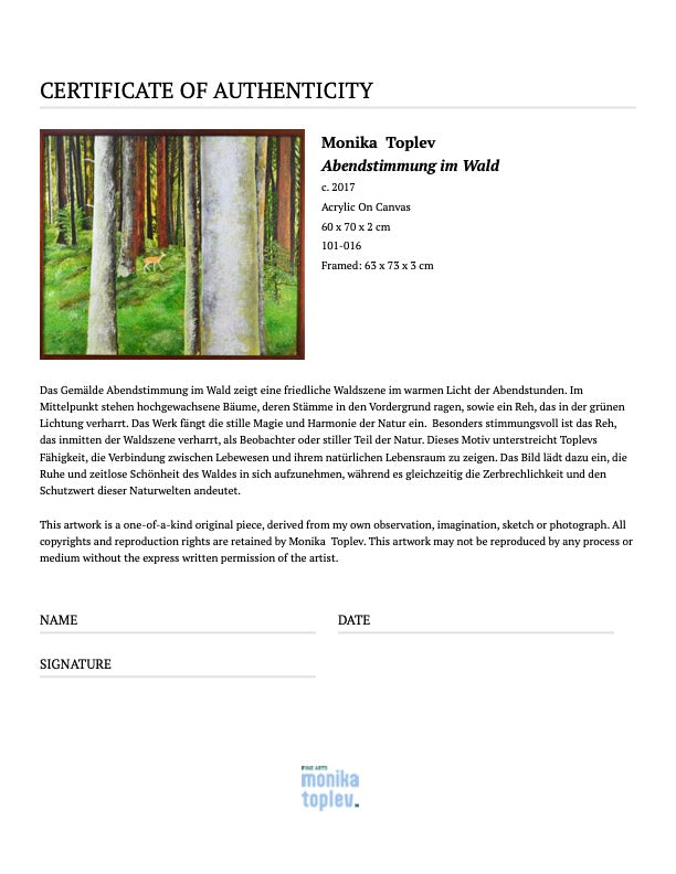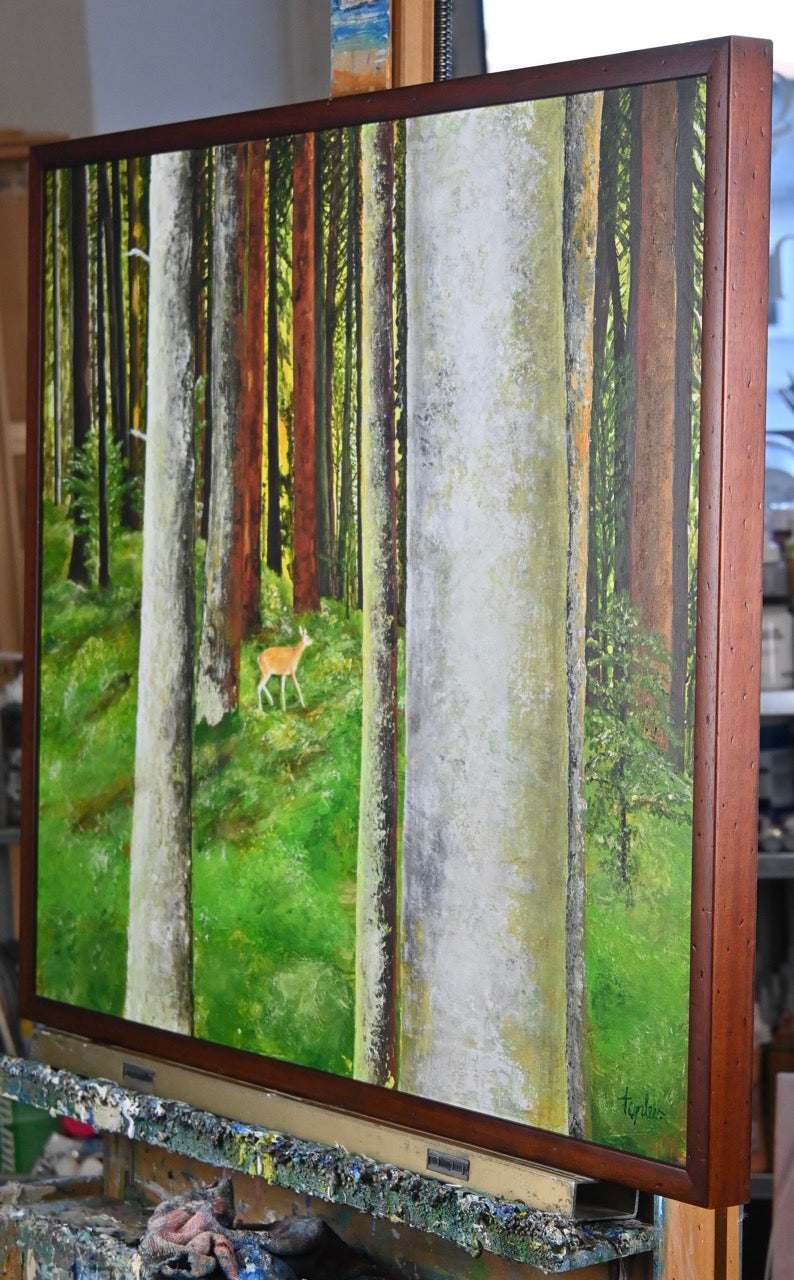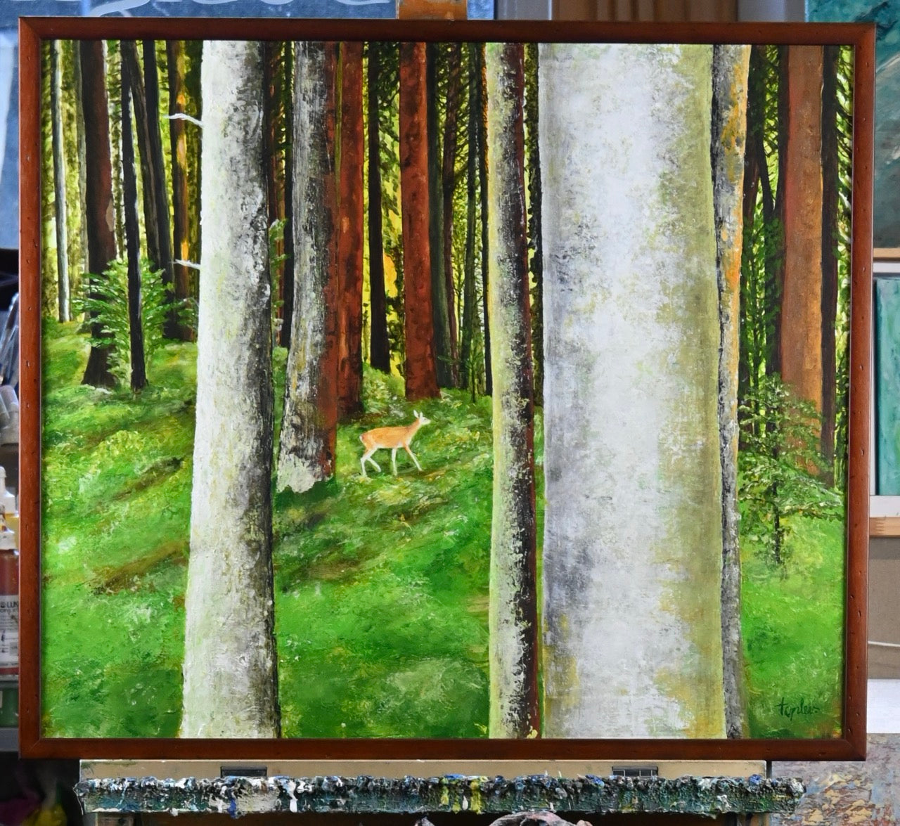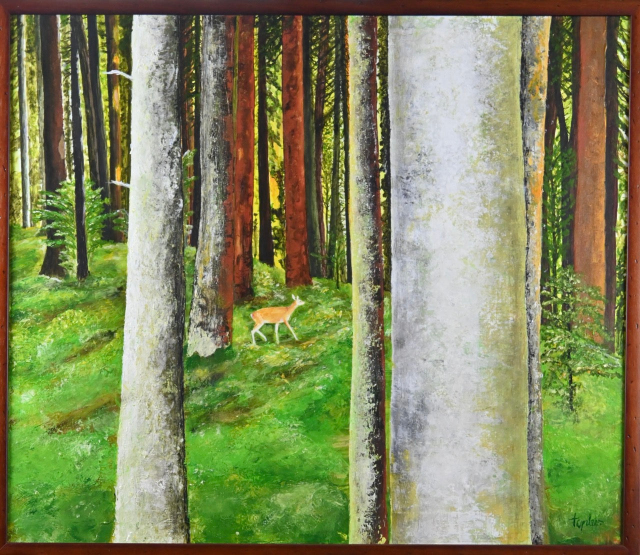 Besonders stimmungsvoll ist das Reh, das inmitten der Waldszene verharrt, als Beobachter oder stiller Teil der Natur. Dieses Motiv unterstreicht Toplevs Fähigkeit, die Verbindung zwischen Lebewesen und ihrem natürlichen Lebensraum zu zeigen. Das Bild lädt dazu ein, die Ruhe und zeitlose Schönheit des Waldes in sich aufzunehmen, während es gleichzeitig die Zerbrechlichkeit und den Schutzwert dieser Naturwelten andeutet.