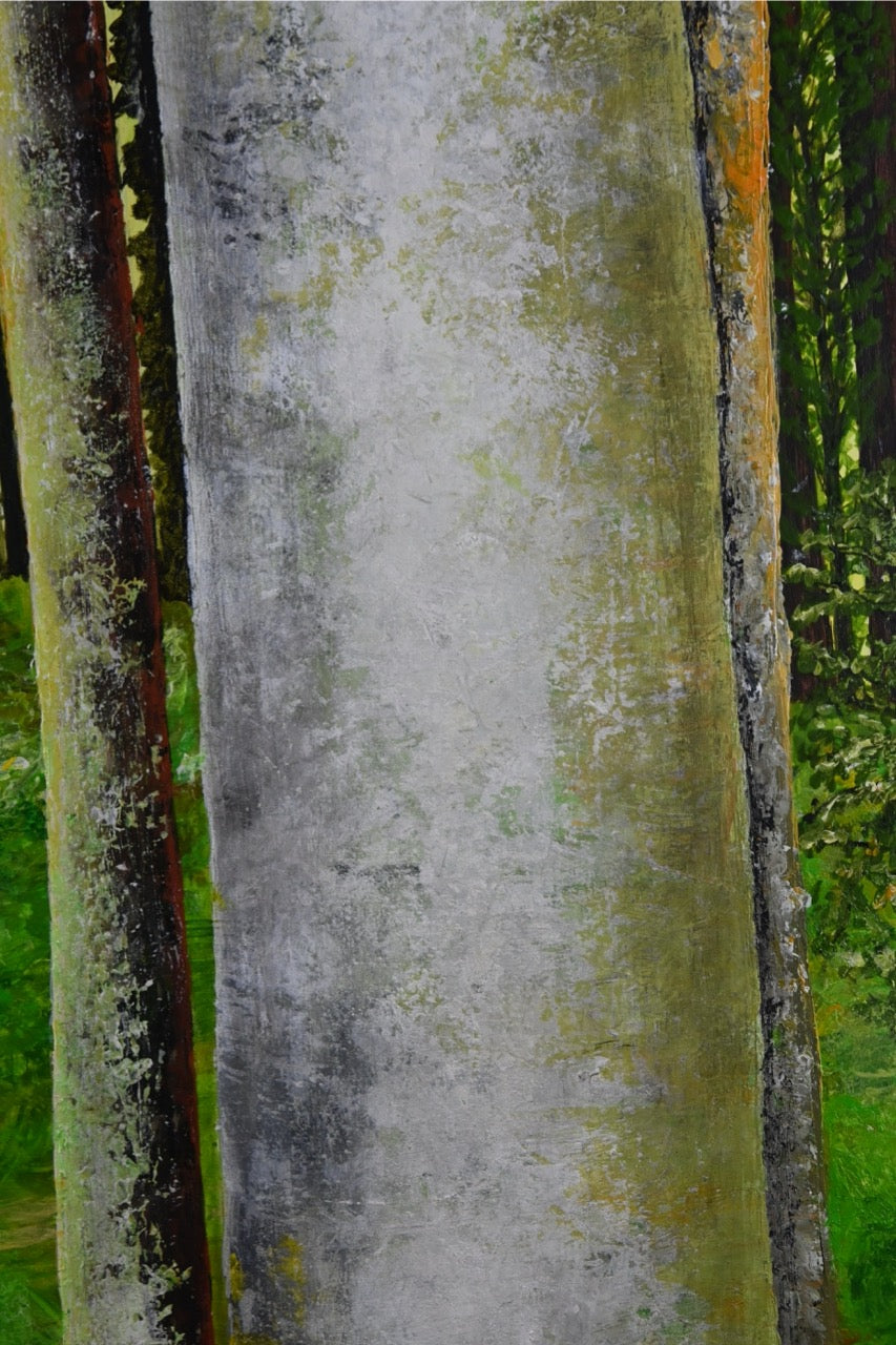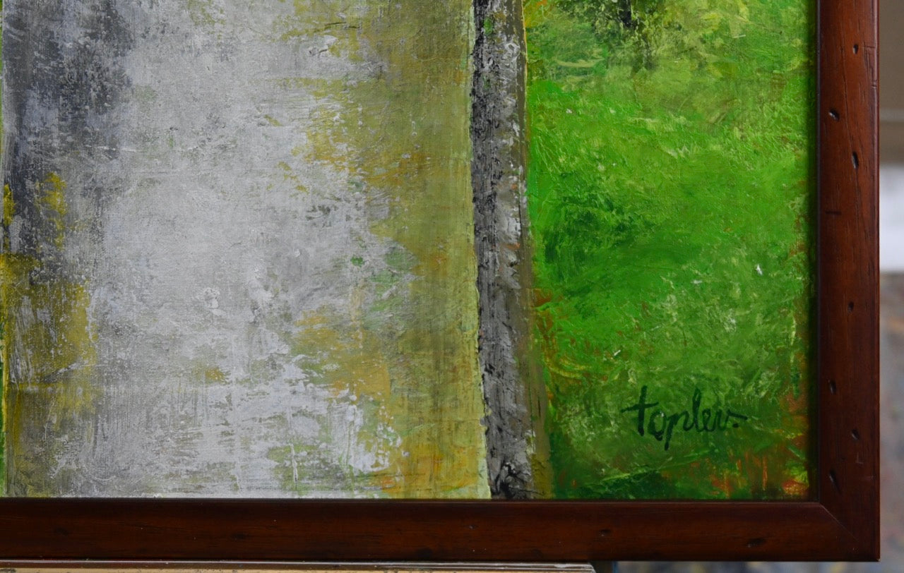 Monika Toplevs Abendstimmung im Wald (Acryl auf Leinwand, 2017, 70x60 cm) vermittelt eine ruhige und meditative Atmosphäre. Im Vordergrund dominieren die breiten, teils moosbewachsenen Baumstämme, die vertikale Strukturen bilden und den Blick in die Tiefe des Waldes lenken. Im Hintergrund schimmert warmes Abendlicht durch die dichtstehenden Baumstämme, wodurch eine sanfte, goldene Beleuchtung entsteht, die das satte Grün der Lichtung betont.