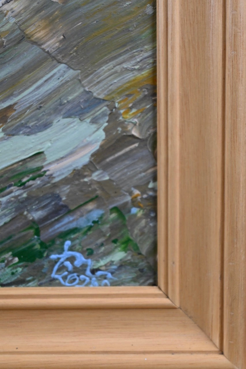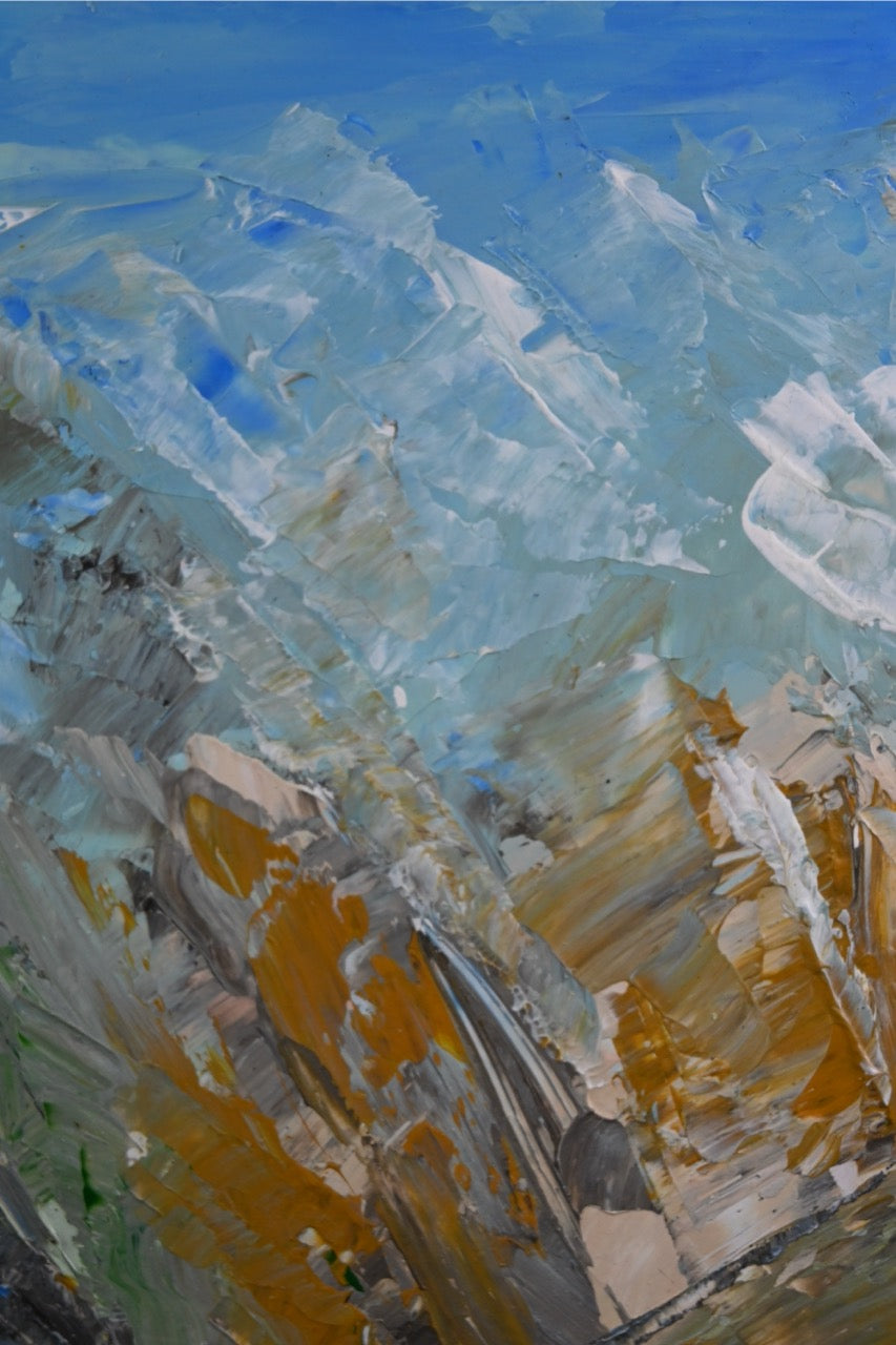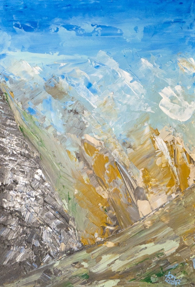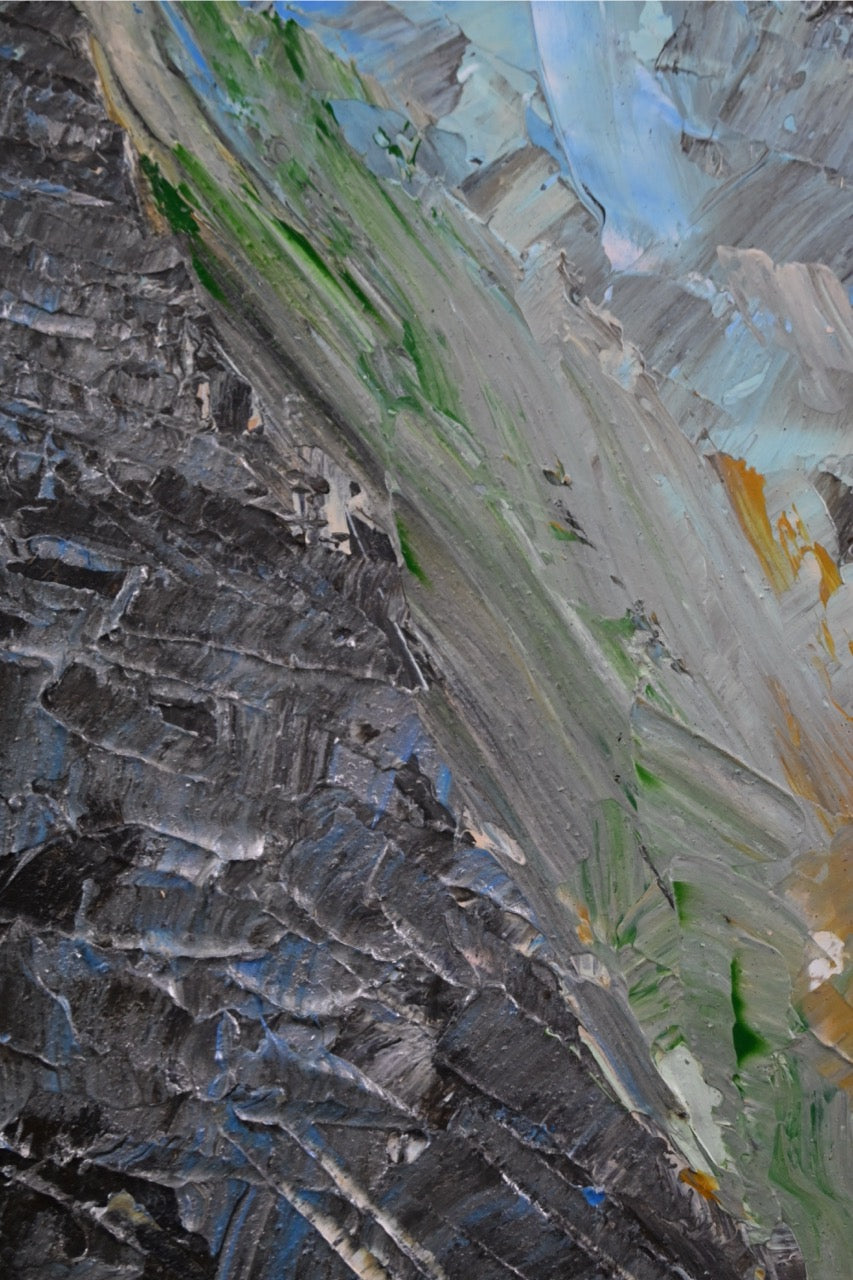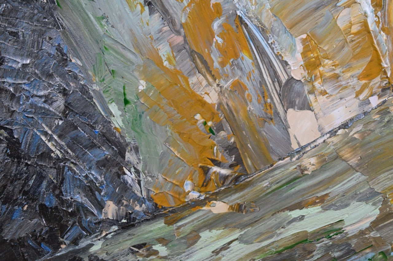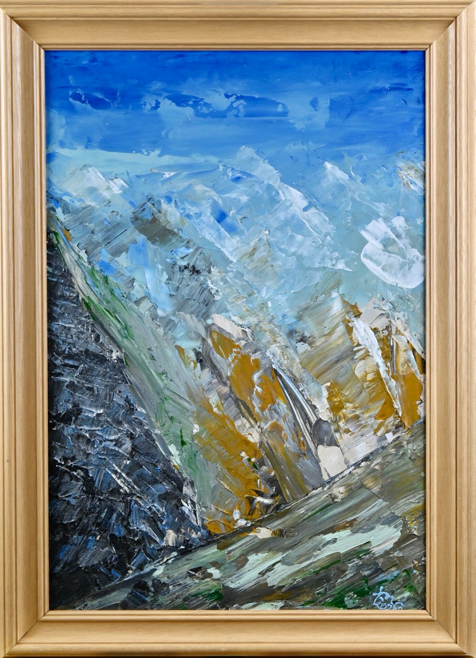 Die dynamischen und groben Spachtelstriche erzeugen eine kraftvolle Wirkung und fangen die rohe Natur der Berglandschaft ein. Die verschiedenen Farbnuancen und die dreidimensionale Struktur lassen die Komposition lebendig wirken und verleihen ihr eine beeindruckende Tiefe.
