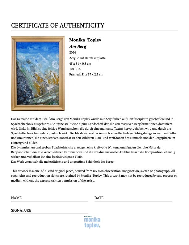Das Gemälde mit dem Titel “Am Berg” von Monika Toplev wurde mit Acrylfarben auf Hartfaserplatte geschaffen und in Spachteltechnik ausgeführt. Die Szene stellt eine alpine Landschaft dar, die von massiven Bergformationen dominiert wird. Links im Bild ist eine felsige Wand zu sehen, die durch eine markante Textur hervorgehoben wird und durch die Spachteltechnik besonders plastisch wirkt. Rechts davon erstrecken sich schroffe, farbige Gebirgshänge in warmen Gelb- und Brauntönen, die einen starken Kontrast zu den kühleren Blau- und Weißtönen des Himmels und der Bergspitzen im Hintergrund bilden.