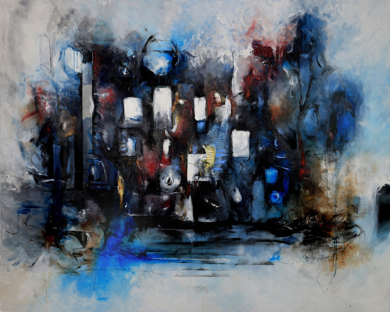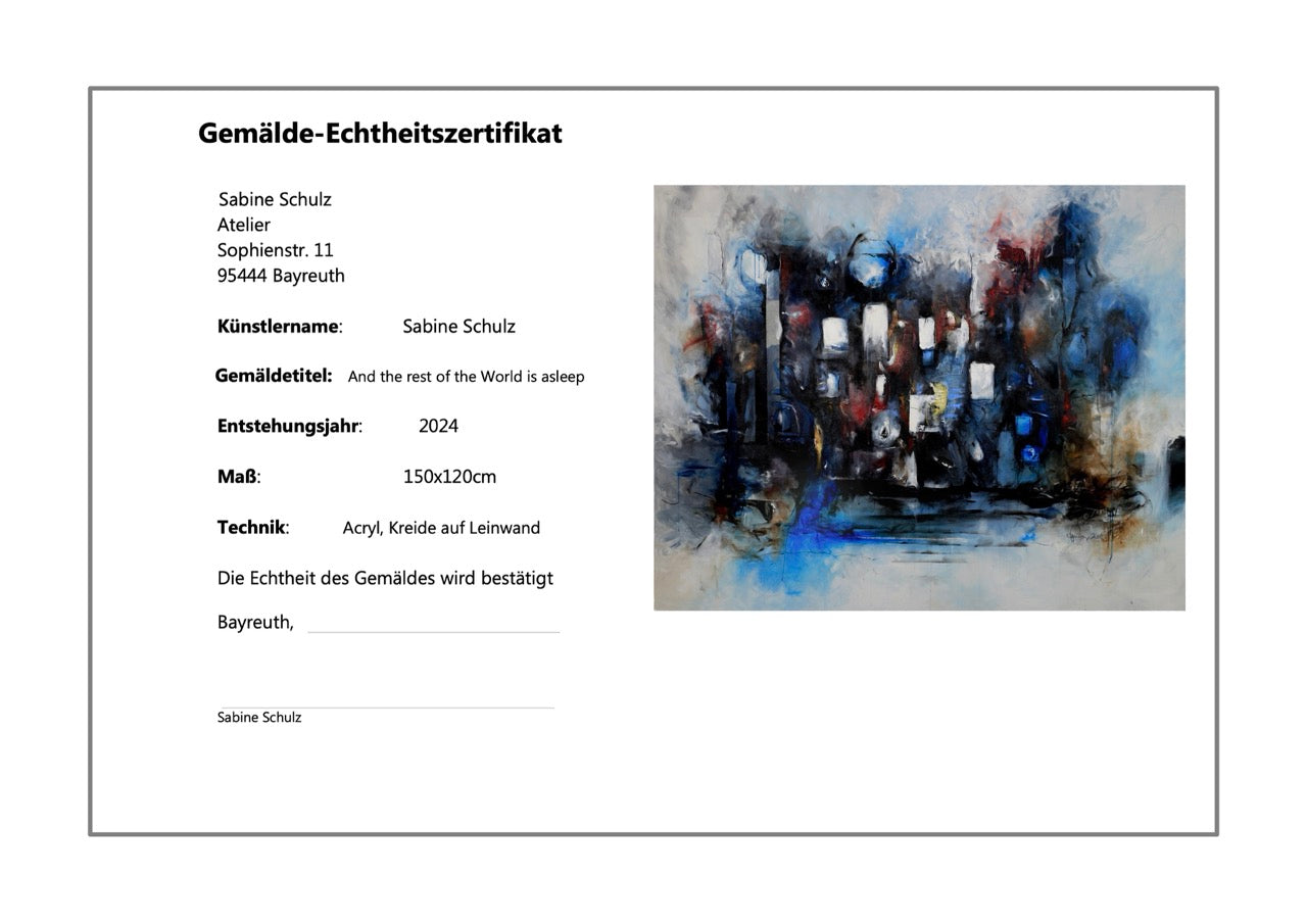 Das Gemälde „And the Rest of the World is Asleep“ entfaltet auf 150 x 120 cm eine eindrucksvolle nächtliche Bildwelt – eine abstrakte Stadtansicht, die zugleich von innerer Ruhe wie auch untergründiger Bewegung geprägt ist. Mit Acryl und Kreide auf Leinwand gelingt eine Komposition, die durch starke Kontraste, flirrende Lichtfenster und dichte Farbflächen eine stimmungsvolle Szenerie zwischen Traum und Wachheit evoziert.