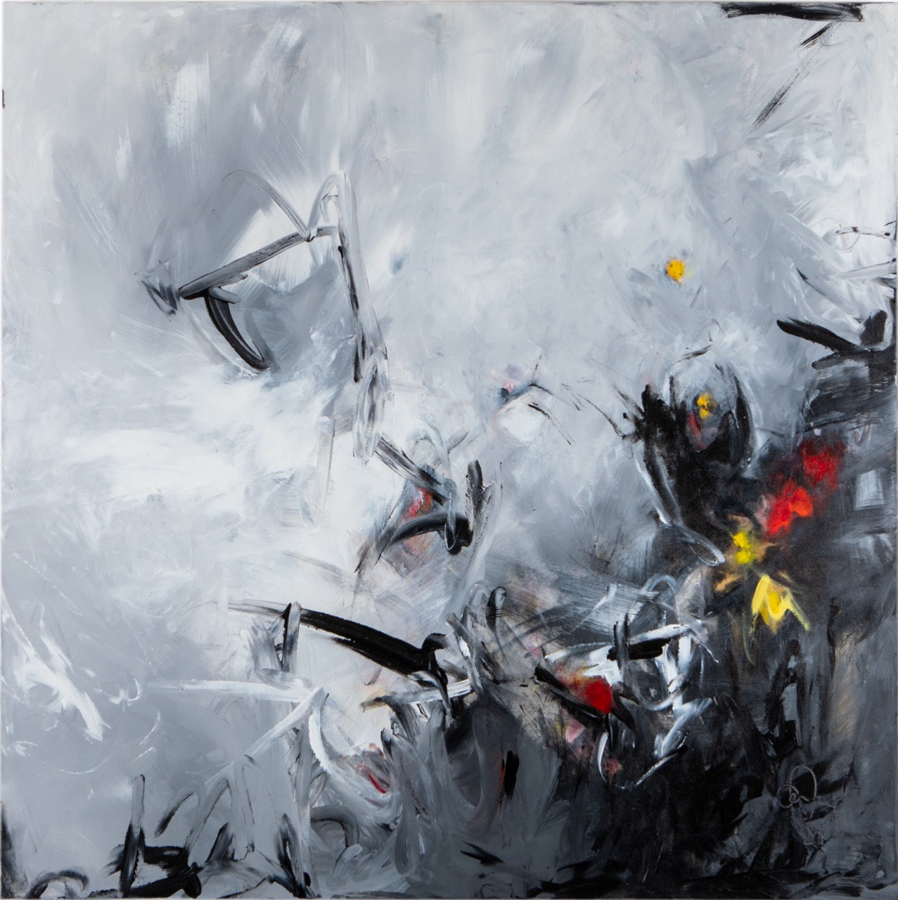 Die Bildfläche ist von silbrig-grauen bis weißen Farbzonen durchzogen, die wie Nebel, Wind oder offene Weite wirken – ein offener Raum, in dem sich Bewegung entfaltet. Aus diesem Raum brechen schwarze, geschwungene Linien hervor, teils wie Schleifen, teils wie fragmentierte Flugbahnen. Sie durchziehen das Bild mit rhythmischer Energie und lassen an Geschwindigkeit, Richtungswechsel oder Aufbruch denken. Im rechten unteren Bereich verdichten sich diese Linien in dunklen, fast wirbelartigen Formen, durchsetzt von kräftigem Rot und leuchtendem Gelb. Diese Kontraste verstärken die Wirkung von Licht und Hitze, von Emotion und Dringlichkeit.