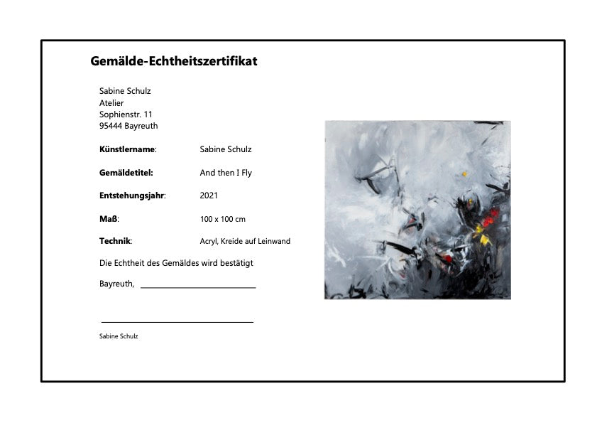 Der Titel „And Then I Fly“ verweist auf eine plötzliche Wendung, auf das Überwinden von Schwere, auf einen Akt der Befreiung. Das Bild erzählt von diesem Moment des Abhebens – nicht wörtlich, sondern als Zustand des Übergangs, der Transformation, der Loslösung. Es bleibt offen und deutungsvoll, kraftvoll und zugleich fragil – ein Bild der Bewegung, das im Betrachter Resonanz erzeugt.