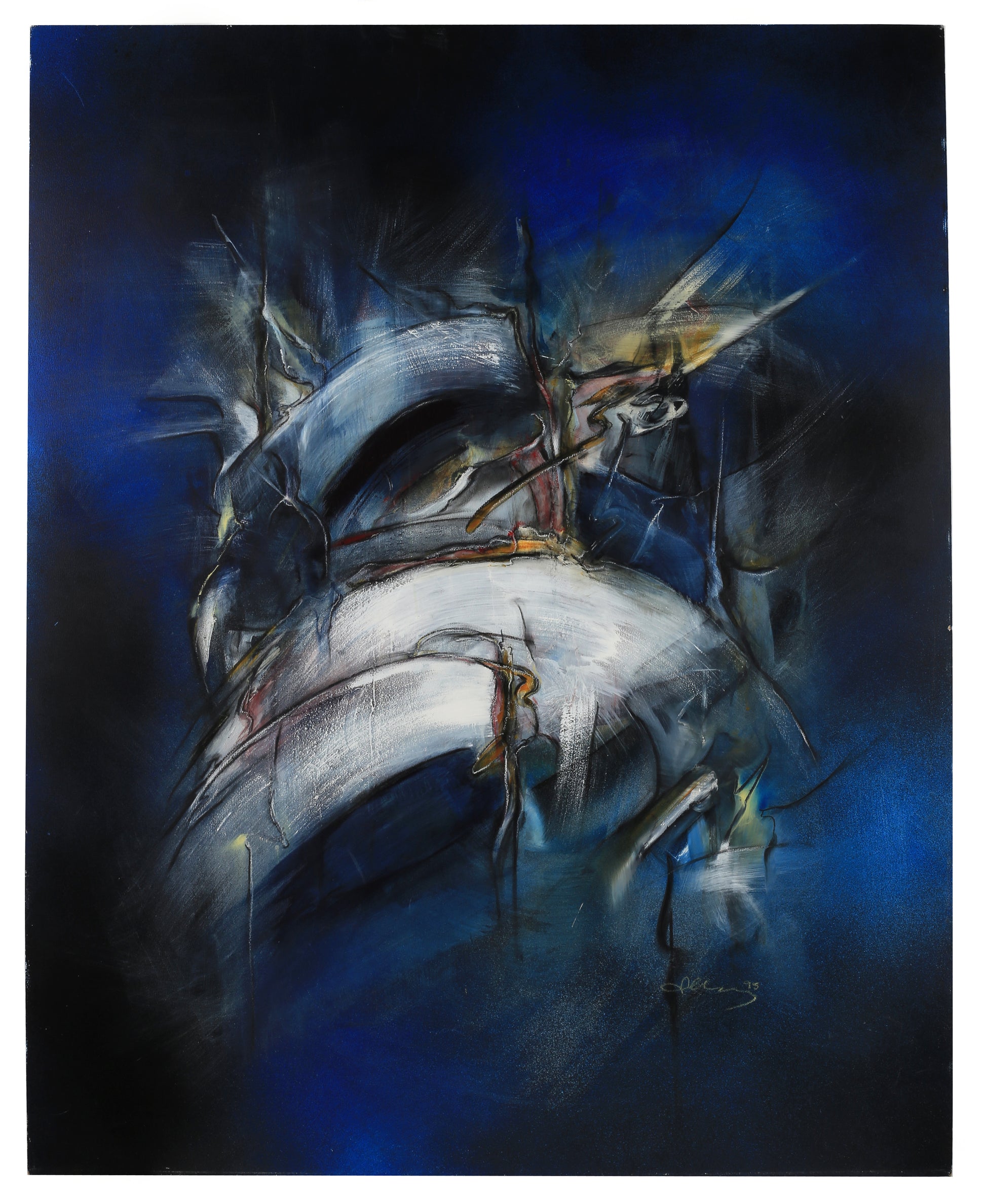 Vor einem tiefblauen, fast kosmisch anmutenden Hintergrund erhebt sich eine dynamische Formation aus geschwungenen, weißlich-silbrigen Formen, die an organische Strukturen oder technische Fragmente erinnern. Sie scheinen sich aus der Dunkelheit herauszulösen und emporzuwachsen – ein Prozess des Werdens, der Transformation oder des Aufstiegs.