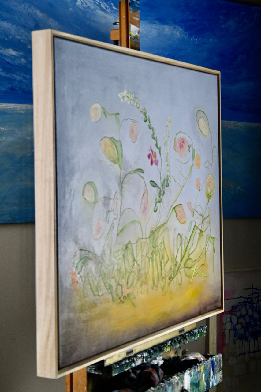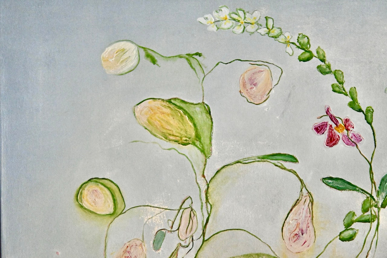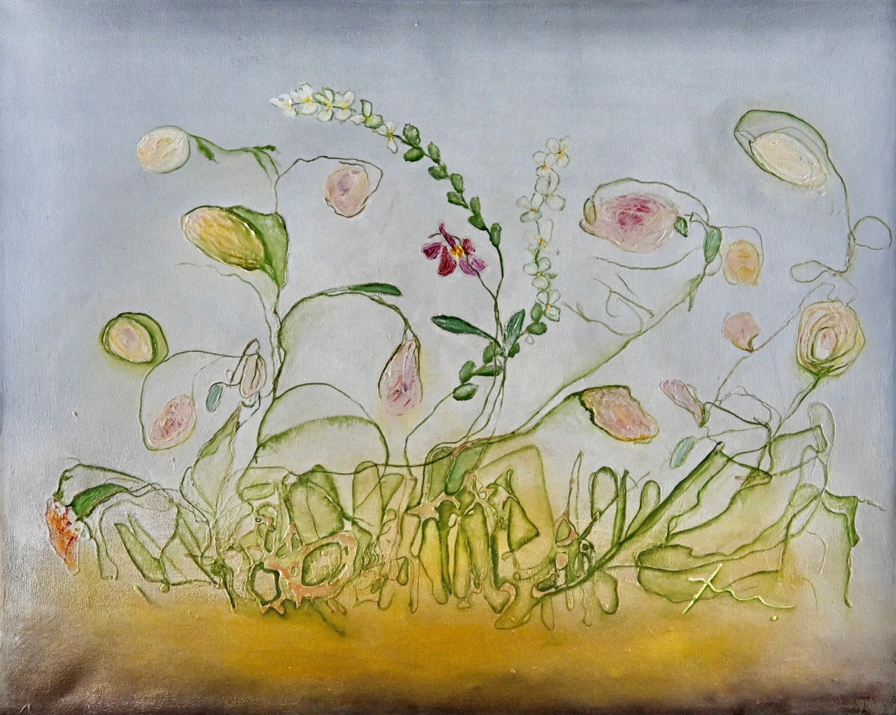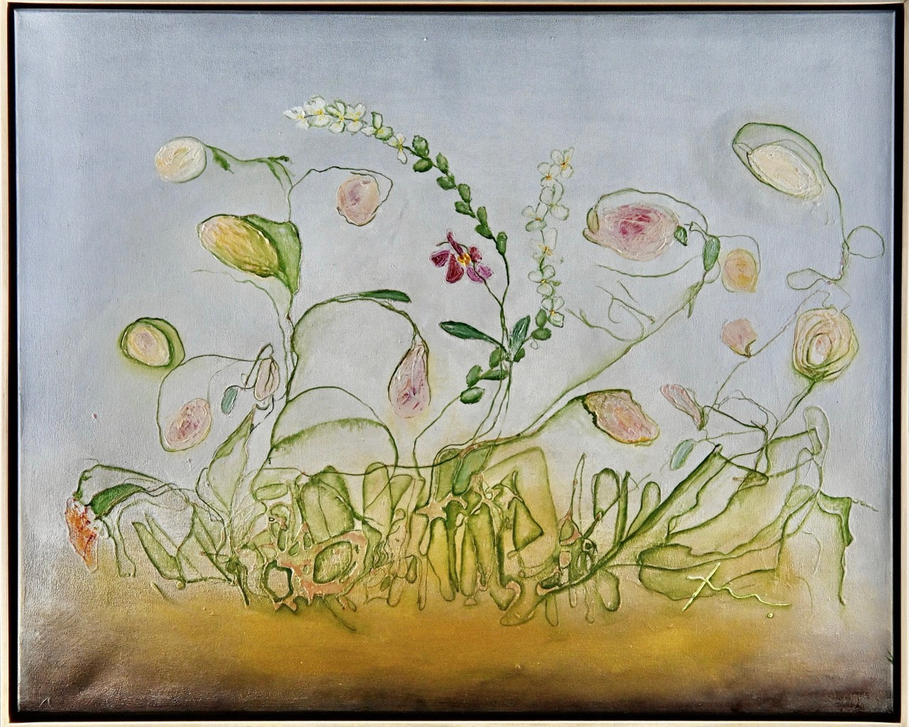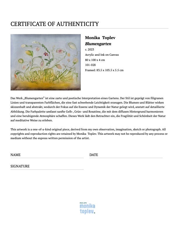 Das Werk „Blumengarten“ von Monika Toplev, geschaffen mit Acryl und Lack auf Leinwand, ist eine zarte und poetische Interpretation eines Gartens. Der Stil ist geprägt von filigranen Linien und transparenten Farbflächen, die eine fast schwebende Leichtigkeit erzeugen. Die Blumen und Blätter wirken skizzenhaft und abstrakt, wodurch der Fokus auf die Essenz und Dynamik der Natur gelegt wird, anstatt auf detaillierte Abbildung. Die Farbpalette umfasst sanfte Gelb-, Grün- und Rosatöne, die mit dem diffusen Hintergrund harmonieren und eine beruhigende Atmosphäre schaffen. Der Lack verleiht dem Bild eine subtile Tiefe und Glanz, wodurch es lebendiger wirkt. Dieses Werk lädt den Betrachter ein, die Fragilität und Schönheit der Natur auf meditative Weise zu erleben.
