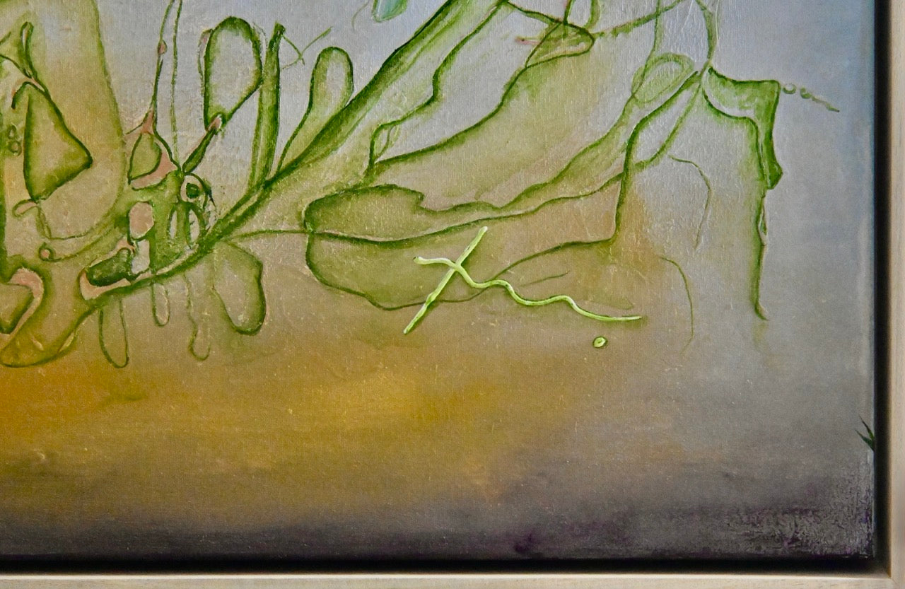 • Der Einsatz von Lack in Kombination mit Acryl verleiht ihren Bildern eine besondere Oberflächenstruktur und Glanz. Dieser Effekt erzeugt Tiefe und hebt einzelne Elemente subtil hervor, was auch in diesem Werk spürbar ist.