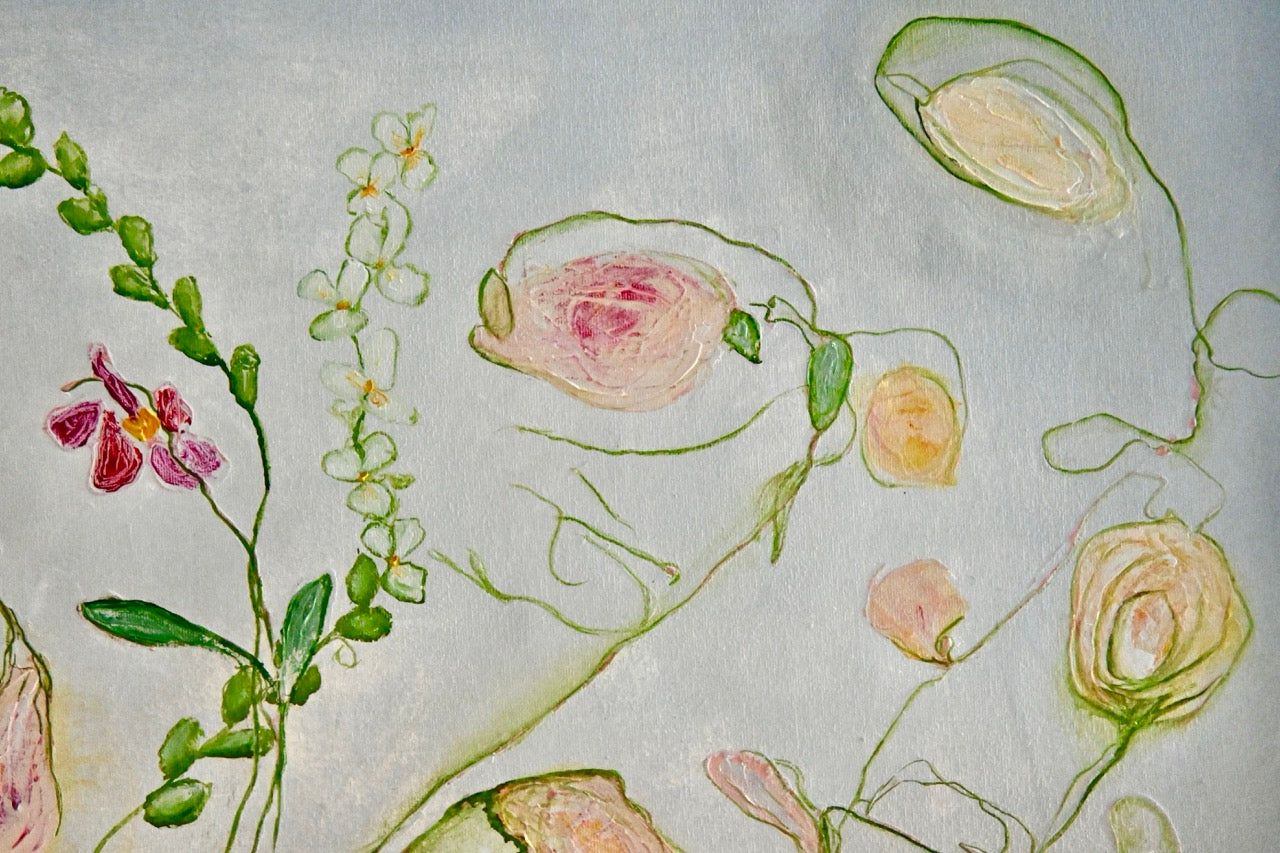 • Ihre Werke haben häufig eine erkennbare Komposition, bleiben jedoch offen und dynamisch. Die Blumen und Blätter sind zwar geordnet, wirken aber dennoch frei und intuitiv, was eine Balance zwischen Planung und Spontaneität zeigt.