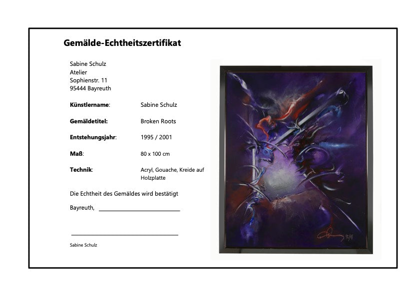 Das Gemälde „Broken Roots“ ist eine eindringliche, visuell kraftvolle Arbeit, die durch ihre tiefviolette Farbigkeit, dynamische Linienführung und energetische Raumgestaltung eine starke emotionale Wirkung entfaltet. Die Komposition bewegt sich zwischen Abstraktion und Symbolik – eine visuelle Erzählung über Aufbruch, Bruchstellen und verborgene Energieflüsse.