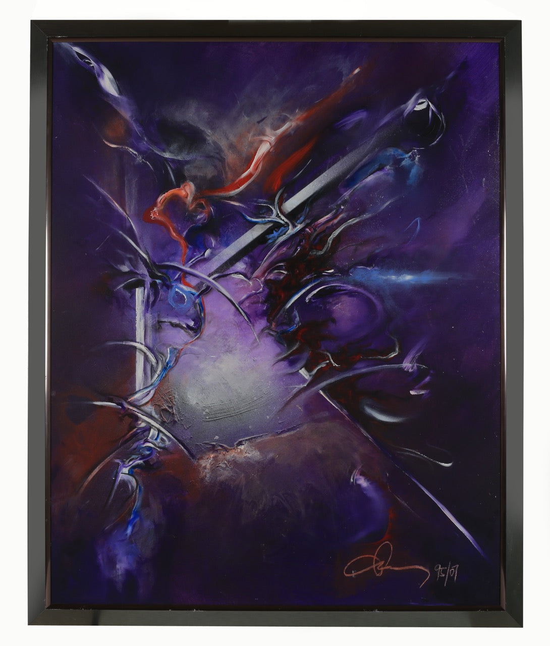 kalligrafischen Linien und plastischen Übergängen, die teilweise reliefartig aus dem Bild hervortreten. Die Verbindung von dunklen, gesättigten Farbflächen mit hellen Kontrasten erzeugt ein Wechselspiel aus Spannung und Tiefe, Zerstörung und Licht – eine Komposition voller Bewegung und Verdichtung.