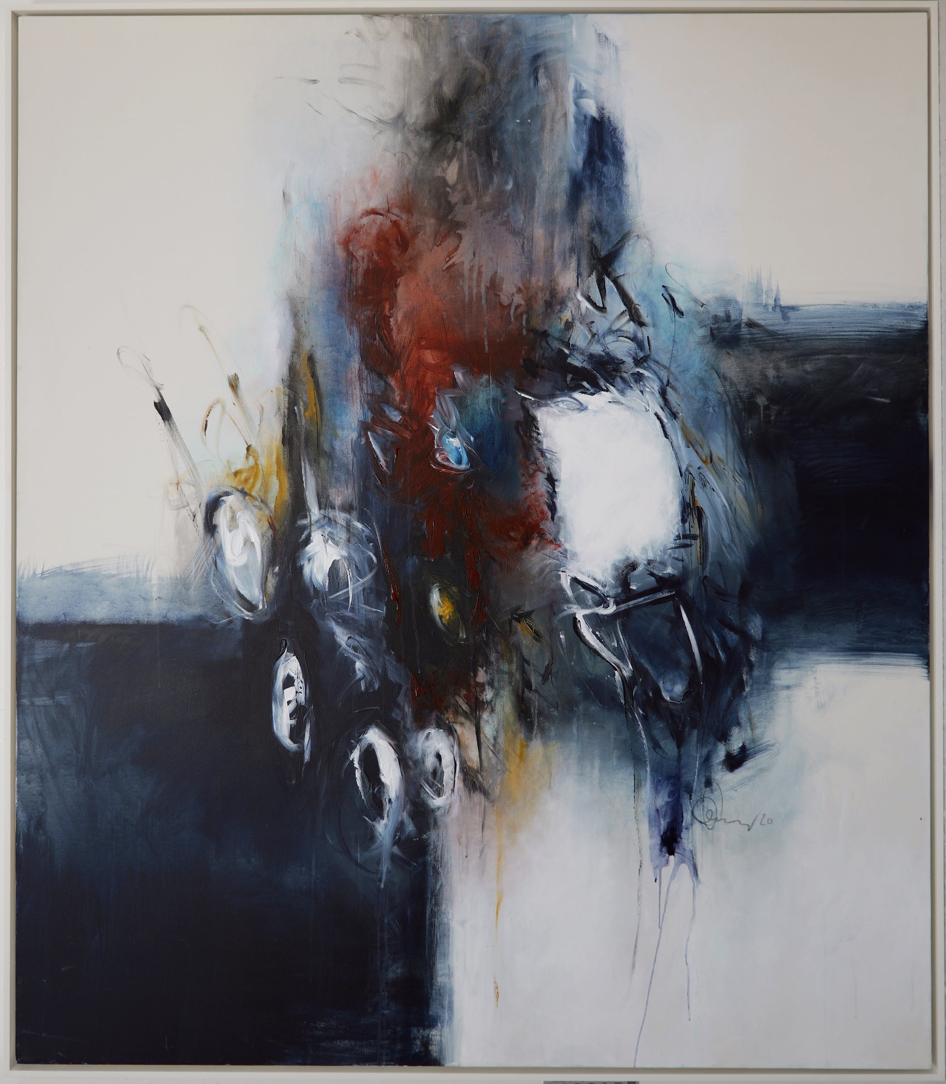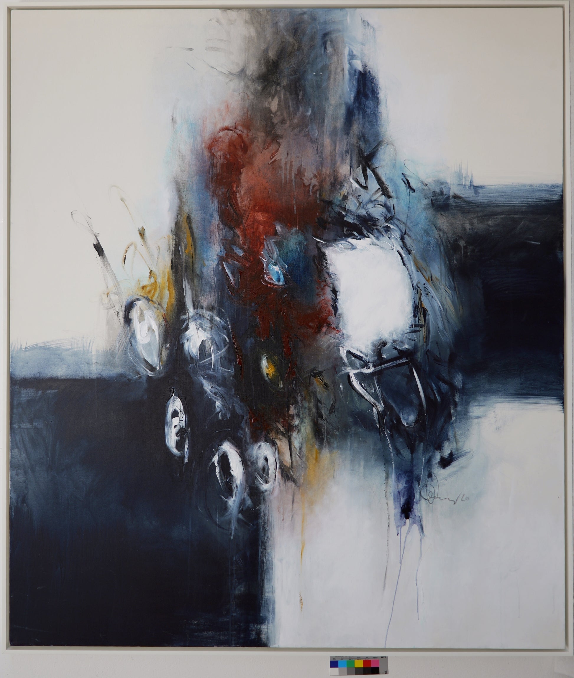 Das Bild ist ein abstraktes Gemälde mit einer hellen Farbpalette, die hauptsächlich Weiß, Blau und Rot verwendet.