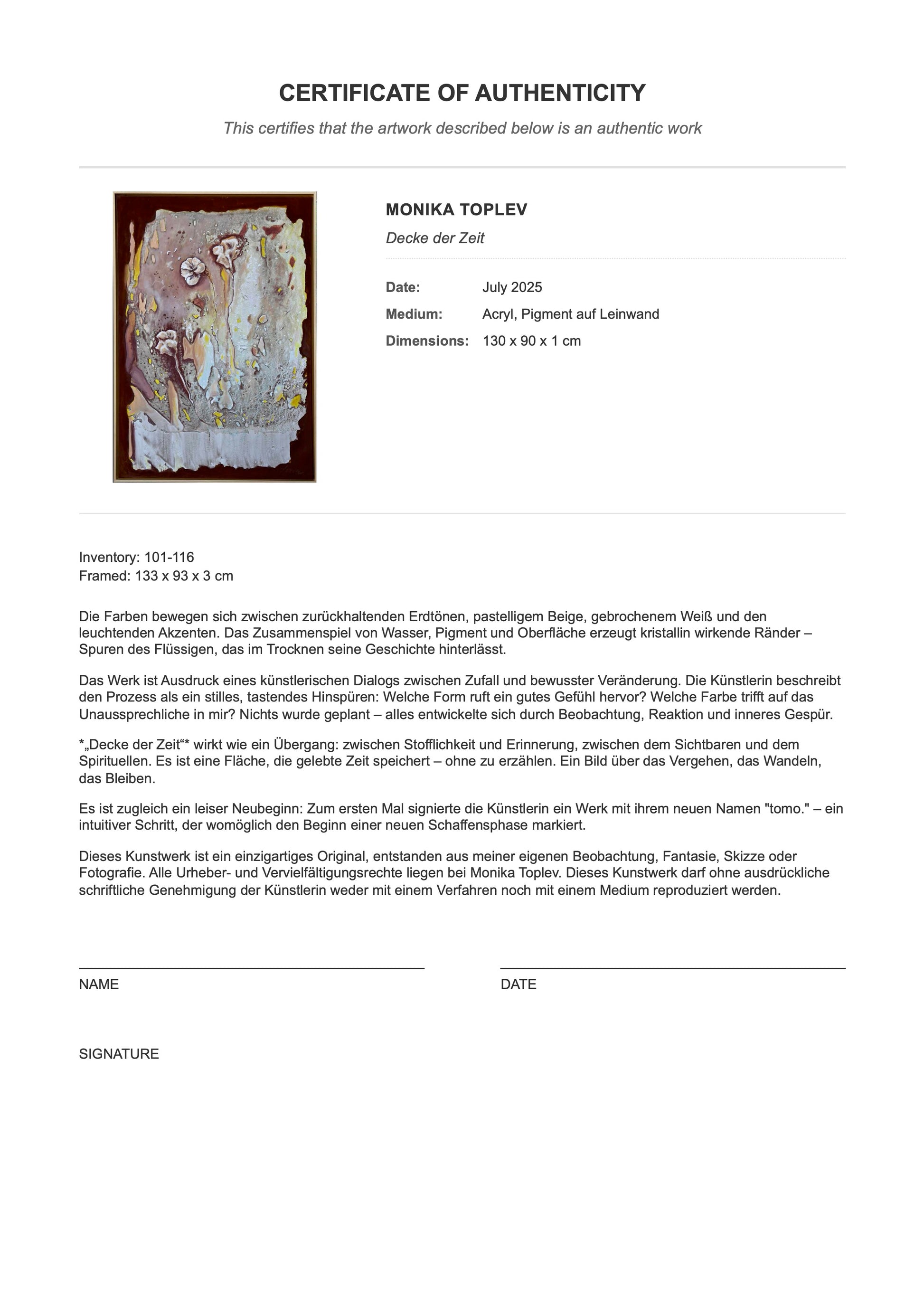 Es ist zugleich ein leiser Neubeginn: Zum ersten Mal signierte die Künstlerin ein Werk mit ihrem neuen Namen "tomo." – ein intuitiver Schritt, der womöglich den Beginn einer neuen Schaffensphase markiert.