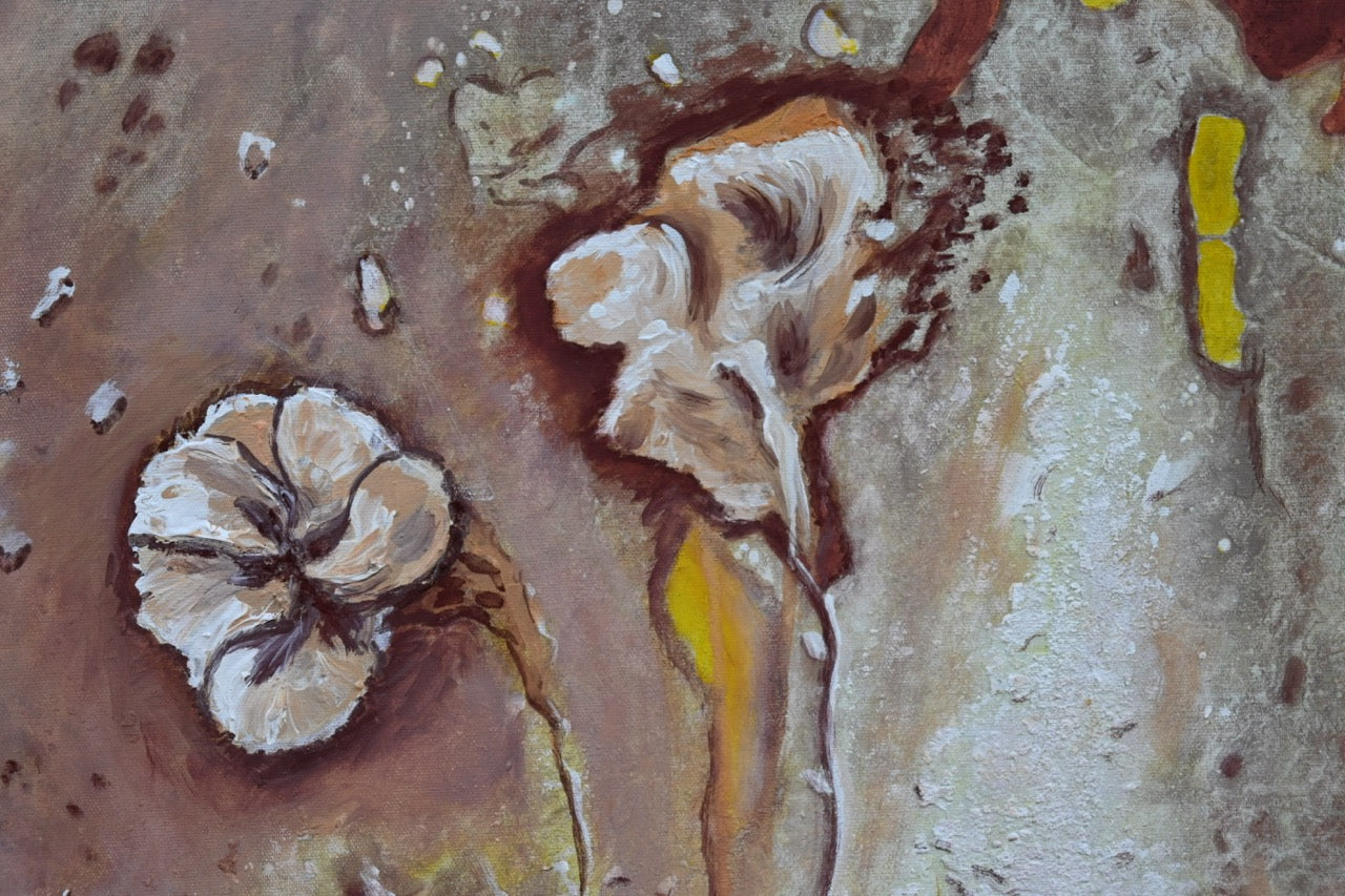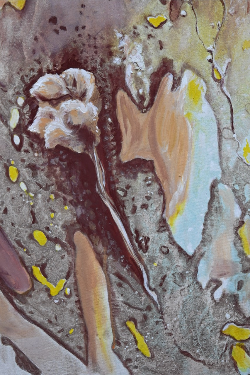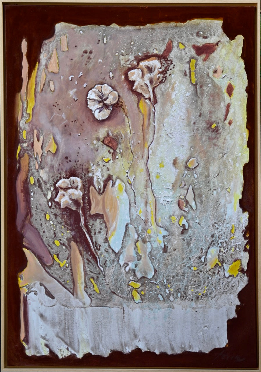 So entstand der Eindruck, als läge noch eine zweite, sich auflösende Stoffschicht über dem Bild – wie eine Decke, die im Begriff ist, zu zerfallen. Zarte schemenhafte Figuren zeichneten sich ab, fast wie Schatten aus einer anderen Zeit. Die Künstlerin reagierte auf diese Spuren intuitiv: Einzelne Formen wurden hervorgehoben, andere übermalt, Farbakzente in Gelb, Hautfarbe und Eisenoxydrot bewusst gesetzt. Der Rand wurde in dunklem Eisenoxyd eingefasst und verleiht dem Werk eine rahmende Erdung. Als letzter malerischer Eingriff kamen drei helle Blüten hinzu – schwebend, fast skizzenhaft – als Zeichen der Schönheit im Prozess des Vergehens.