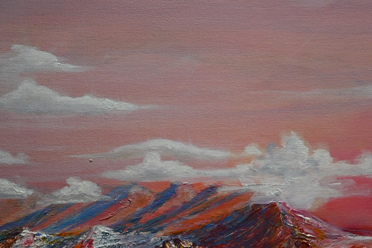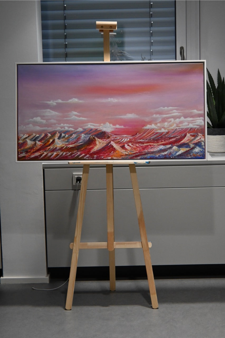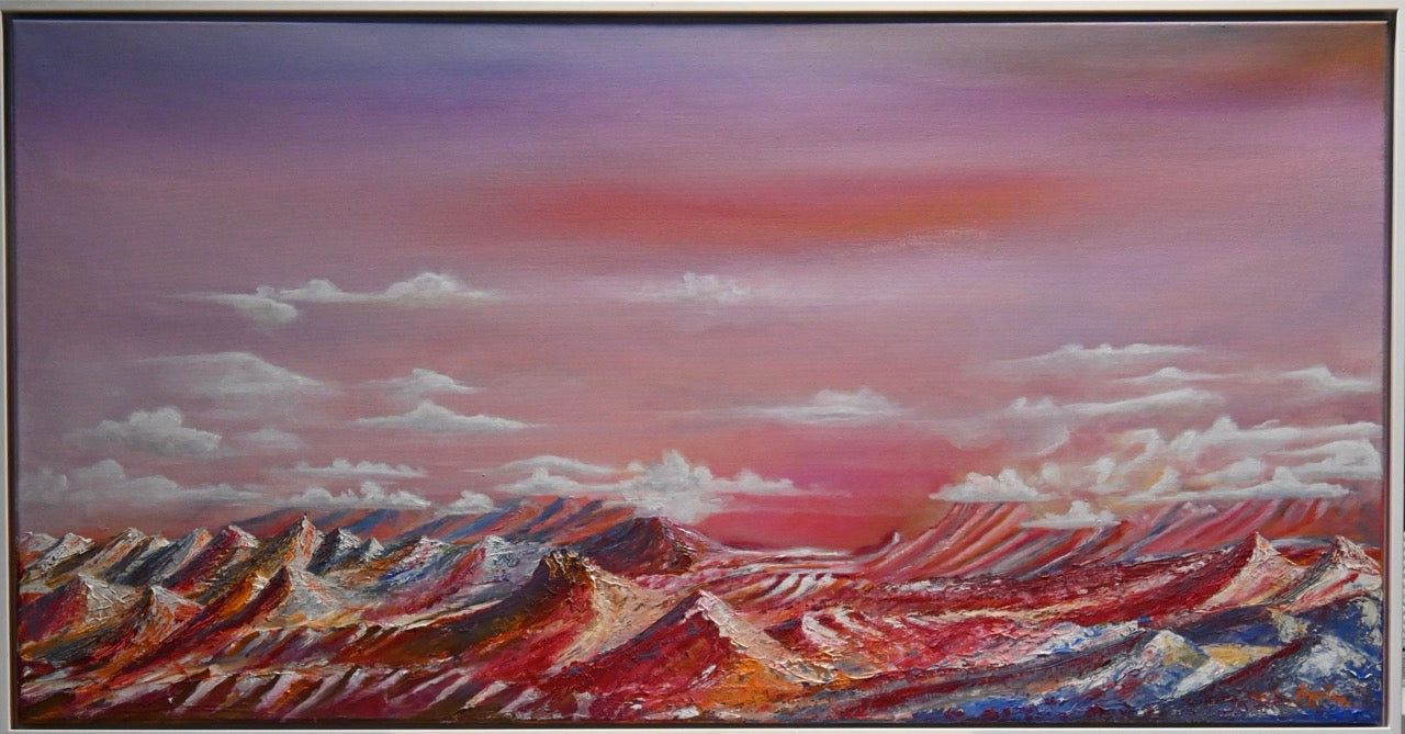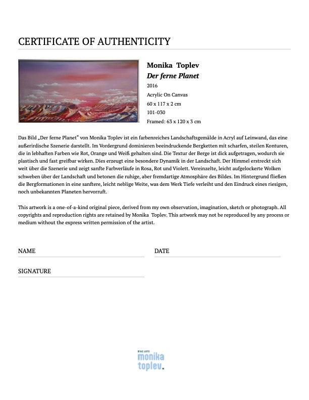 Die Kombination aus dramatisch gestalteten, kantigen Formen und sanften, pastellfarbenen Himmelsübergängen könnte auf eine Ambivalenz zwischen rauer Natur und ästhetischer Schönheit hinweisen. Monika Toplev spielt hier möglicherweise mit der Vorstellung von neuen Welten, der Faszination des Unbekannten und dem Wunsch nach Erkundung. Die fast irrealen Farben und das außerirdische Terrain lassen das Bild gleichzeitig traumhaft und mystisch wirken.