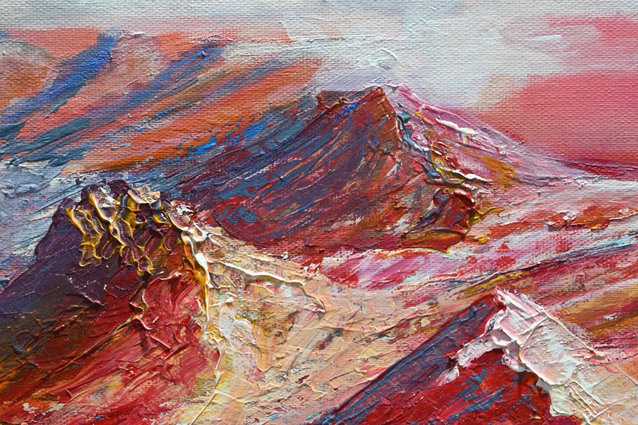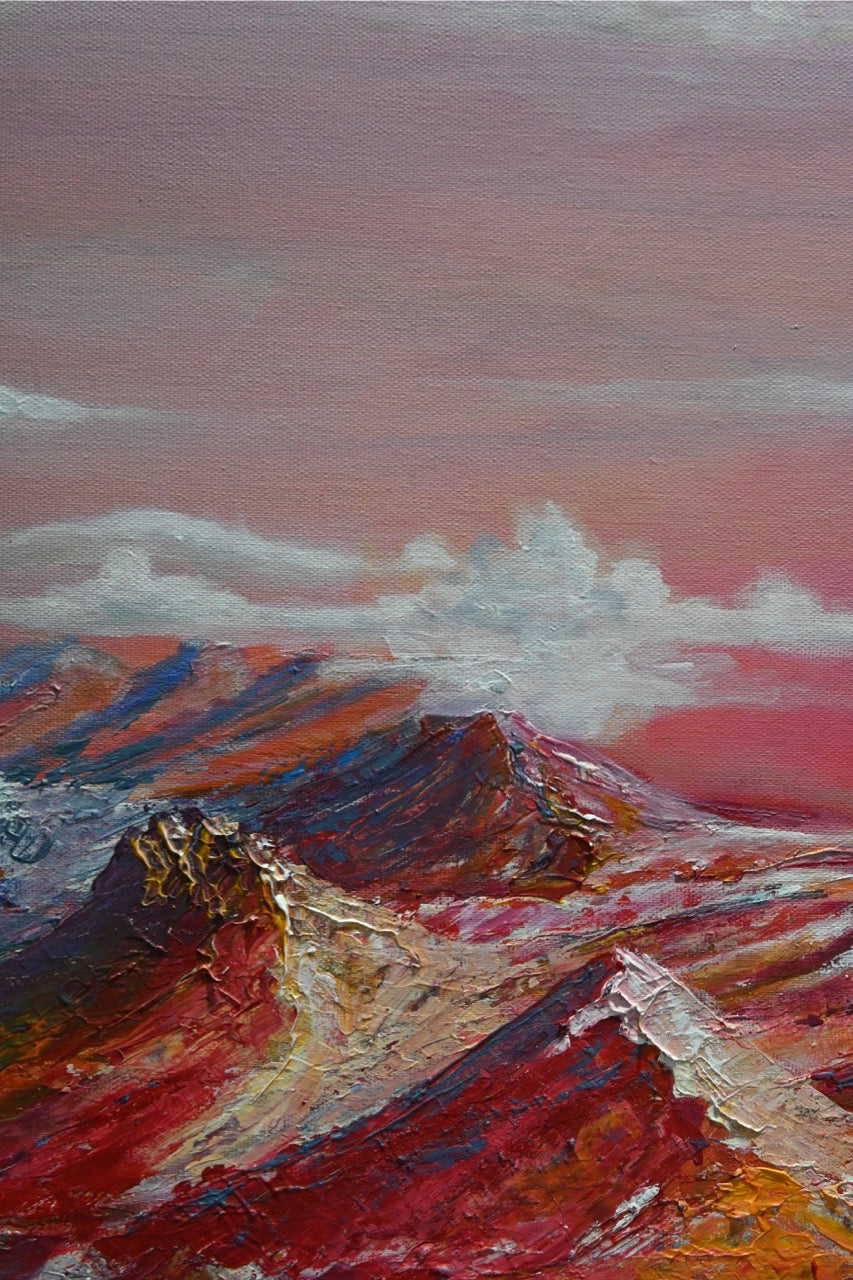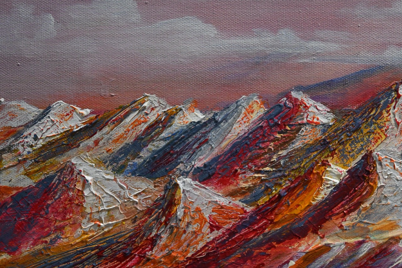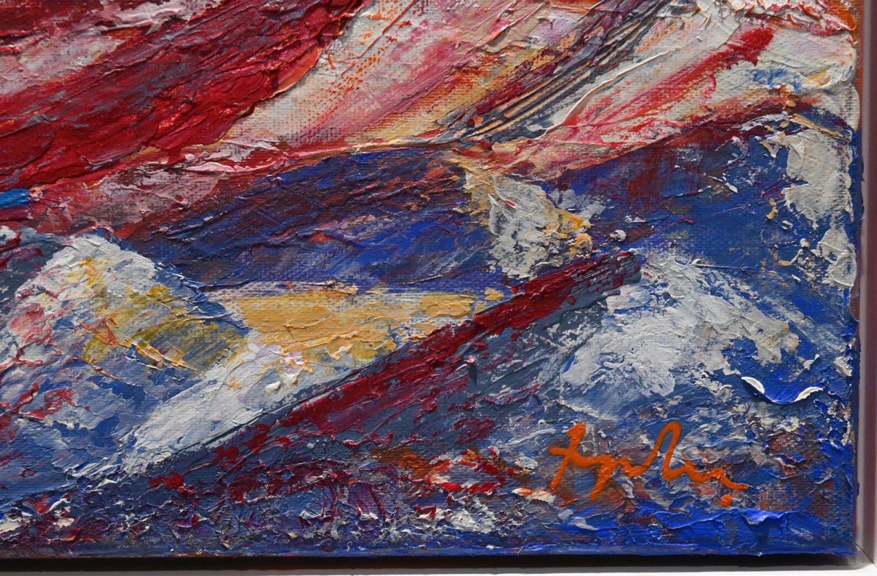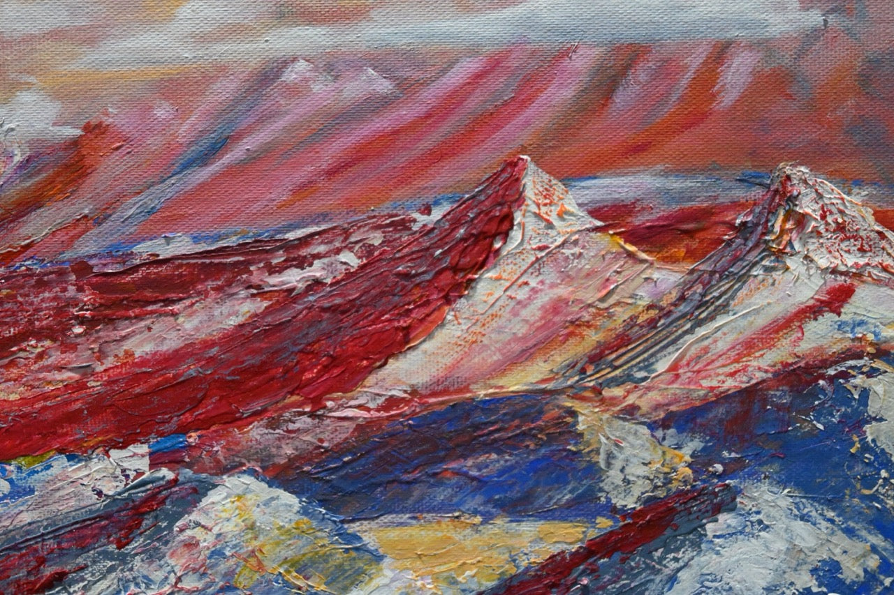 Das Bild „Der ferne Planet“ von Monika Toplev ist ein farbenreiches Landschaftsgemälde in Acryl auf Leinwand, das eine außerirdische Szenerie darstellt. Im Vordergrund dominieren beeindruckende Bergketten mit scharfen, steilen Konturen, die in lebhaften Farben wie Rot, Orange und Weiß gehalten sind. Die Textur der Berge ist dick aufgetragen, wodurch sie plastisch und fast greifbar wirken. Dies erzeugt eine besondere Dynamik in der Landschaft.