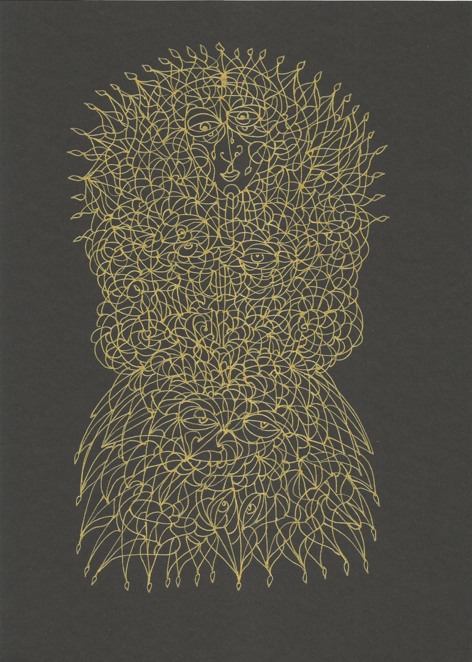 Das Bild zeigt eine majestätische Gestalt, die mit Tränen und Blättern zugleich Schmerz und Erneuerung verkörpert und im Geflecht von Krone und Rock mehrere verborgene Seelen in sich trägt.