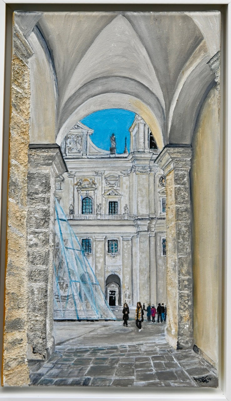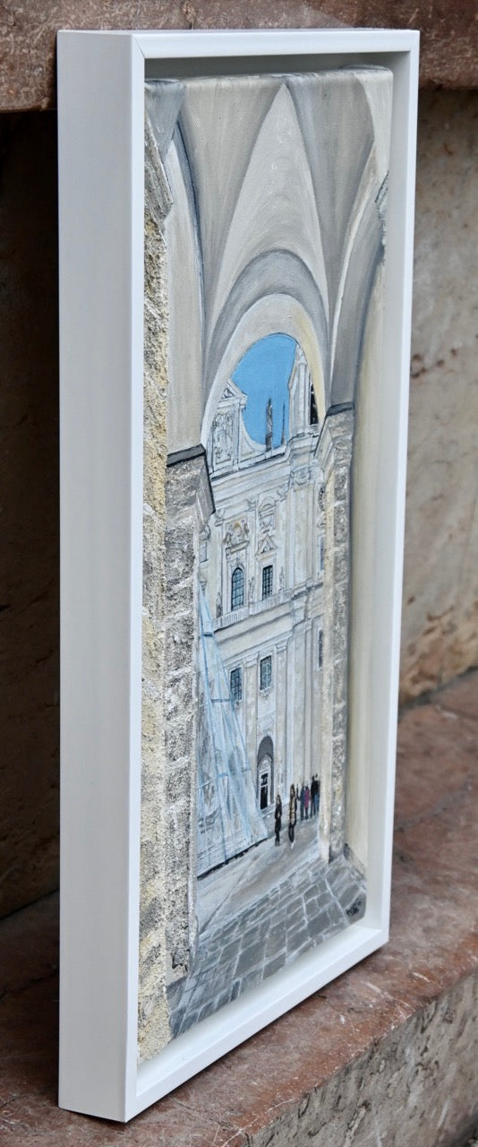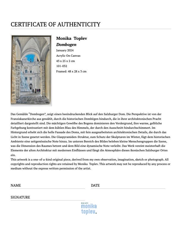 Das Gemälde “Dombogen” von Monika Toplev, mit Acryl auf Leinwand geschaffen, zeigt einen beeindruckenden Blick auf den Salzburger Dom. Die Perspektive ist von der Franziskanerkirche aus gewählt, durch die historischen Dombögen hindurch, die in ihrer architektonischen Pracht detailliert dargestellt sind.