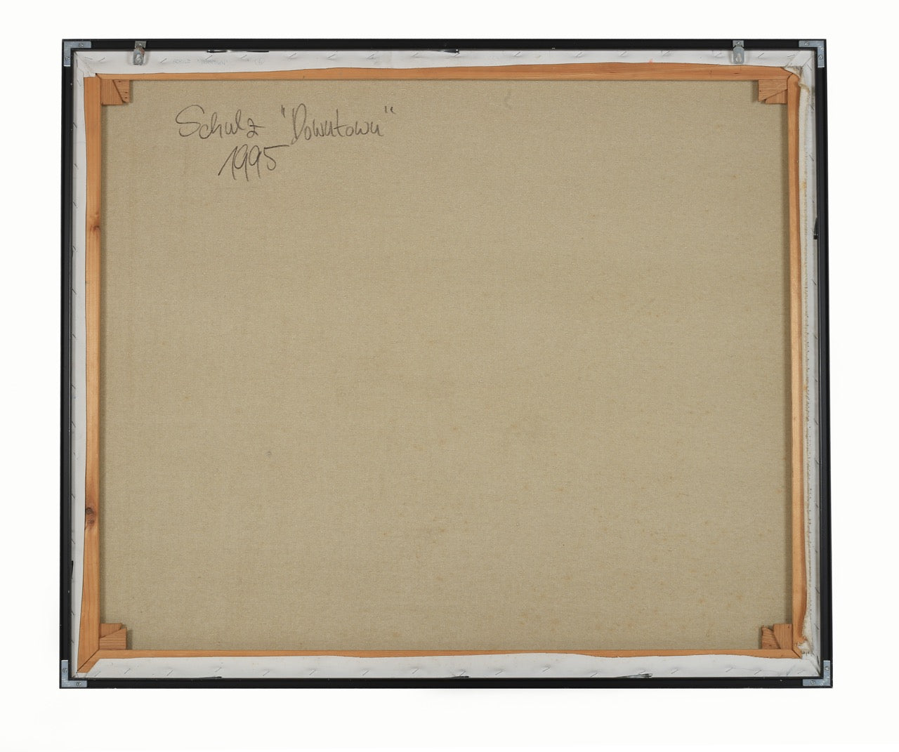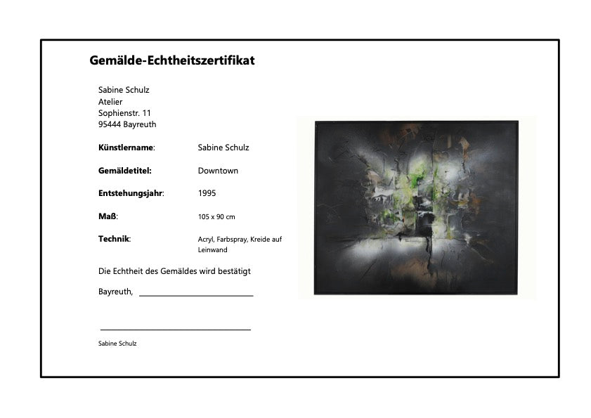 Das Gemälde „Downtown“ (1995) ist ein atmosphärisch verdichtetes Werk, das mit einer Kombination aus Acryl, Farbspray und Kreide auf Leinwand (105 × 90 cm) eine abstrahierte urbane Struktur inmitten einer weitgehend dunklen, beinahe kontemplativen Bildfläche inszeniert. Im Zentrum der Komposition konzentriert sich das Bildgeschehen auf ein vertikales Gefüge aus brüchigen Linien, Lichtreflexen und farblichen Einschüben, das in seiner Fragilität an eine verwitterte Skyline oder ein urbanes Geflecht erinnert.