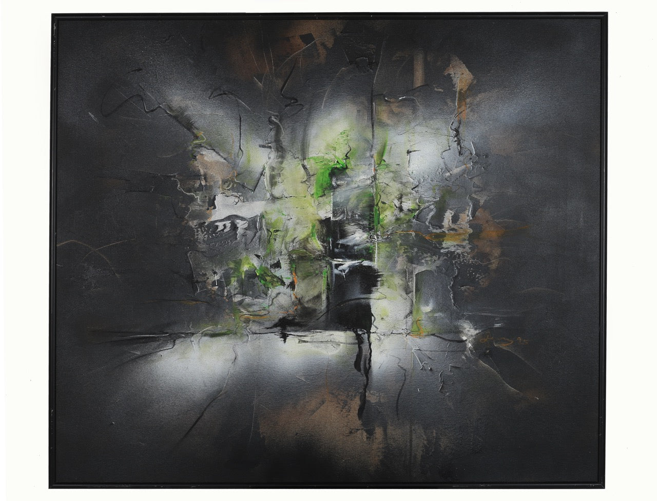 Die Verwendung von Farbspray verleiht der Oberfläche eine diffuse, nebelartige Textur, während die Kreidezeichnungen feine, fast grafische Spuren in die Komposition einschreiben. Diese Mischung aus kontrollierter Geste und spontaner Streuung erzeugt eine spannungsvole Tiefenwirkung. Das Zentrum des Bildes wirkt wie ein fokussierter Lichtkegel, der aus einem dunklen, undefinierten Raum heraus eine flüchtige Struktur sichtbar macht.