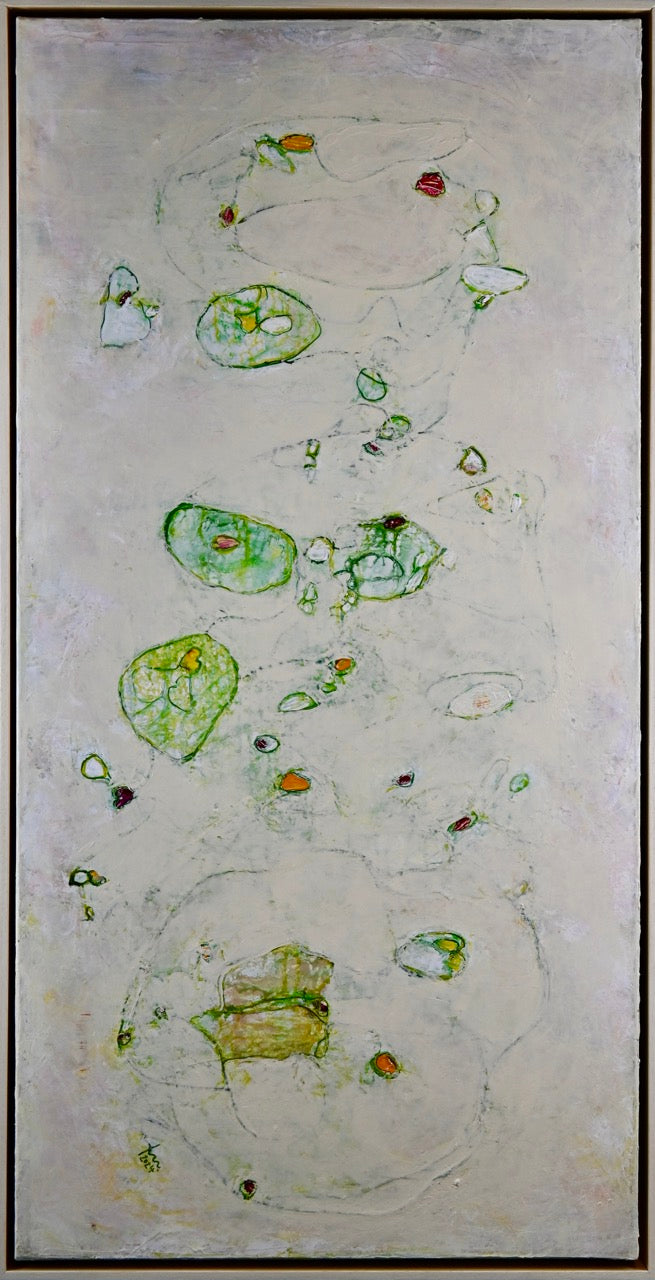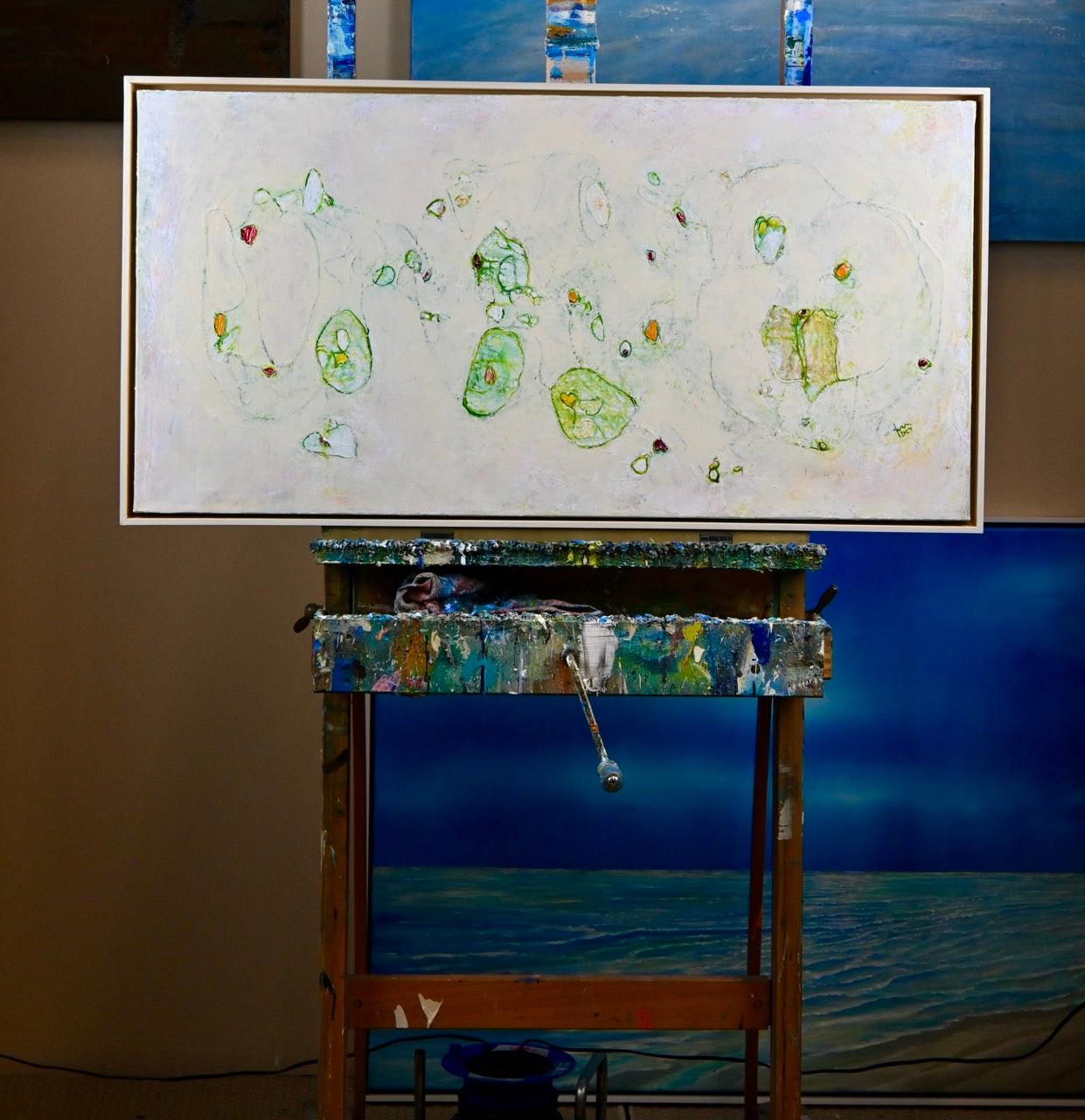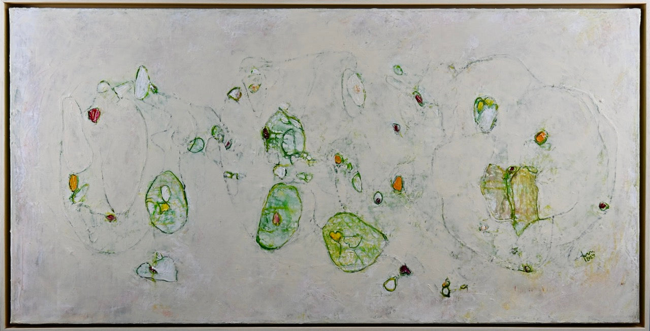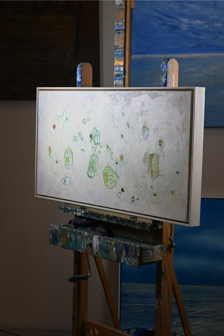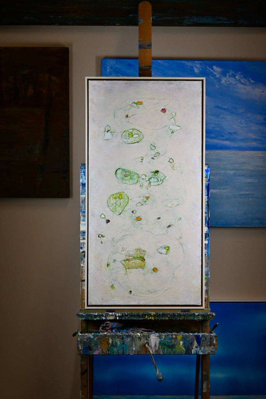 Das Gemälde „Drops of Love“ von Monika Toplev (Acryl auf Leinwand, 2024) ist ein poetisches und zartes Werk, das die Aufmerksamkeit auf Details und symbolische Formen lenkt. Die Komposition zeigt feine, schwebende Tropfen und organisch wirkende Muster in frischen Grüntönen, die von kleinen Farbakzenten in Gelb, Orange und Rot durchbrochen werden.