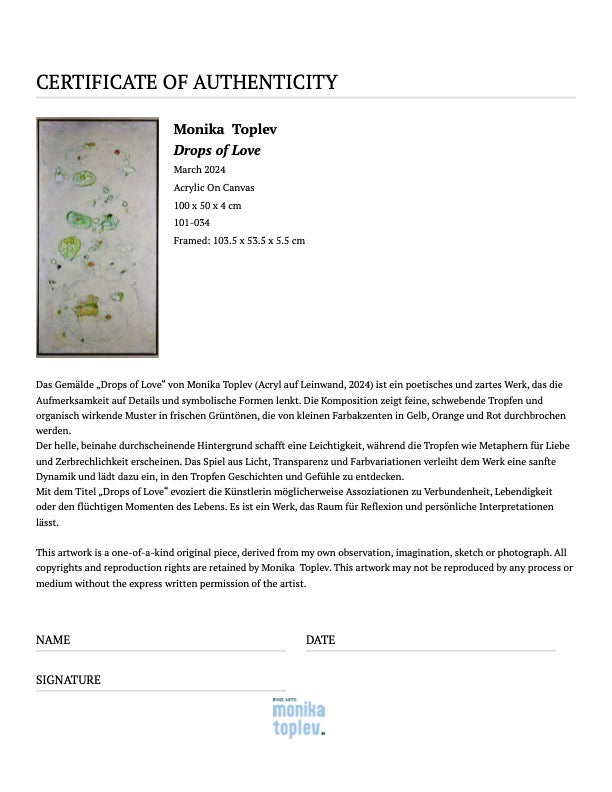 Mit dem Titel „Drops of Love“ evoziert die Künstlerin möglicherweise Assoziationen zu Verbundenheit, Lebendigkeit oder den flüchtigen Momenten des Lebens. Es ist ein Werk, das Raum für Reflexion und persönliche Interpretationen lässt.