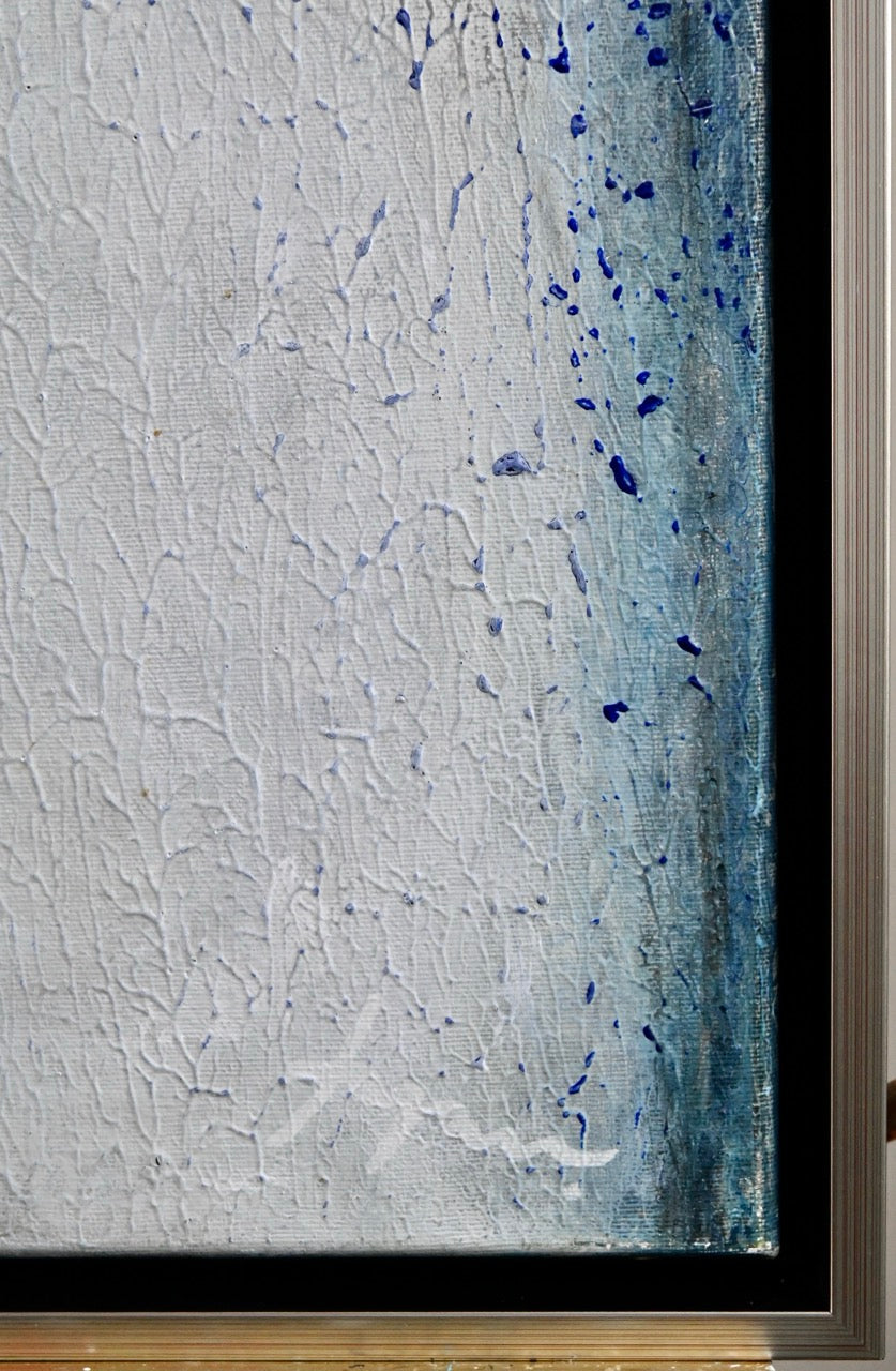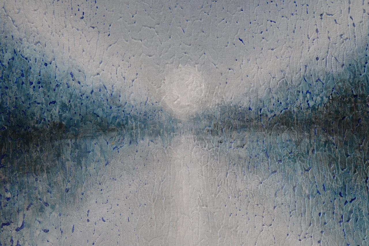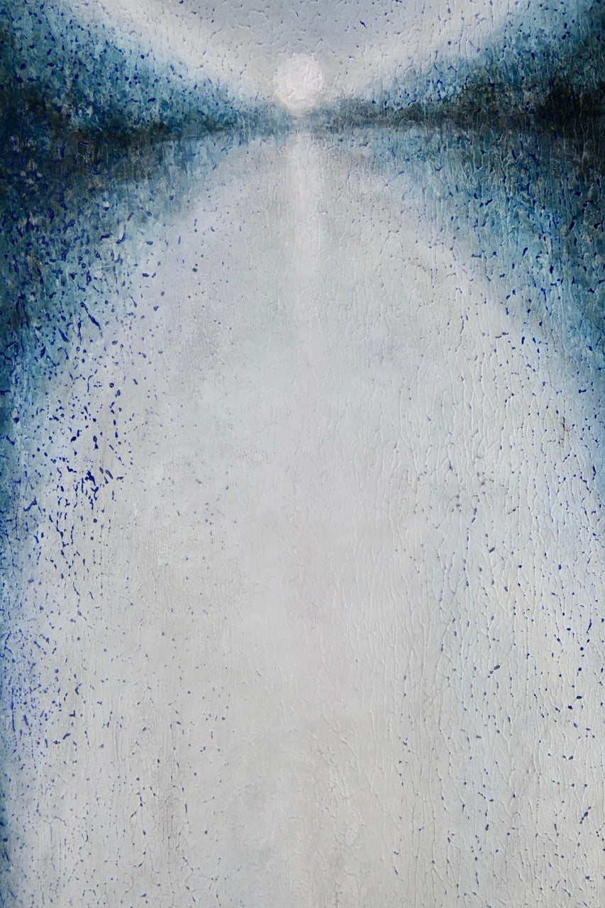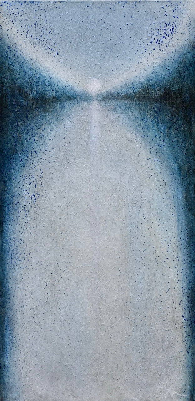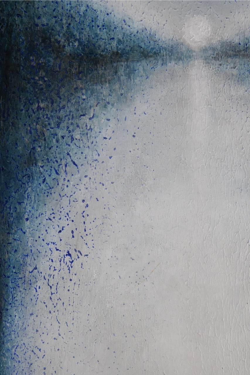 Das Bild ist von kühlen Tönen wie Blau, Weiß und Grau geprägt, die eine meditative und klare Atmosphäre schaffen.