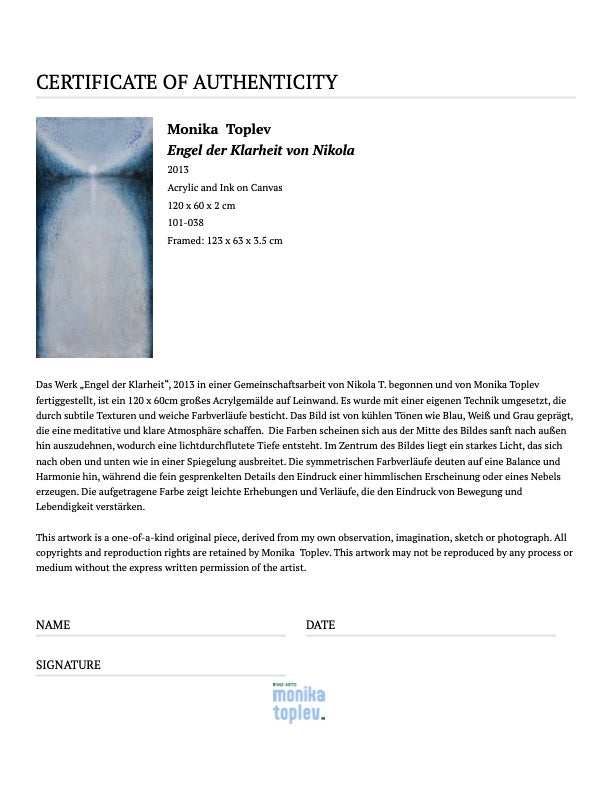 Das Werk „Engel der Klarheit“, 2013 in einer Gemeinschaftsarbeit von Nikola T. begonnen und von Monika Toplev fertiggestellt, ist ein 120 x 60 cm großes Acrylgemälde auf Leinwand. Es wurde mit einer eigenen Technik umgesetzt, die durch subtile Texturen und weiche Farbverläufe besticht.