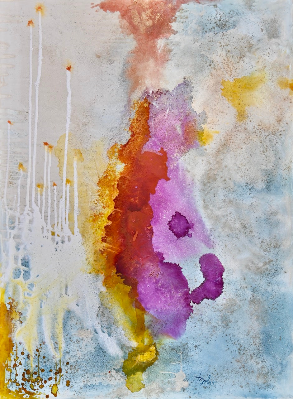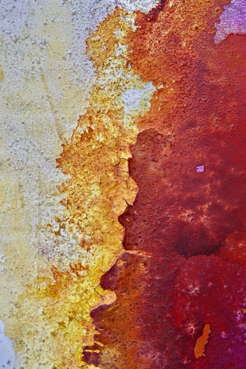 Die Komposition ist geprägt von einer vertikalen Dynamik in warmen Rot-, Violett- und Gelbtönen, die wie eine feurige Energie aus dem Zentrum hervorbricht. Sie wirkt zugleich intensiv und wohltuend – eine Wärme, die trägt. Am rechten Rand öffnet sich eine kühlere Zone in Blautönen, die wie ein Windhauch erscheint. Die aufgebrochene Struktur in der Mitte erinnert an ausgetrocknete Erde – ein Bild des Vergehens, das gleichzeitig einen Neuanfang in sich trägt.