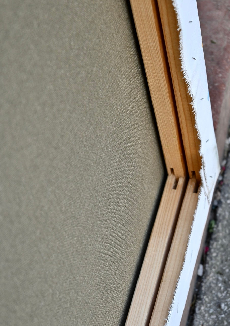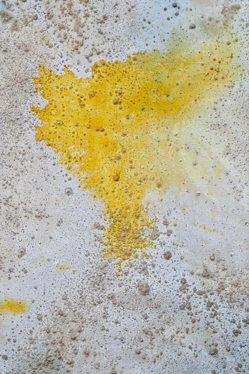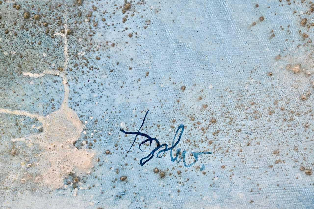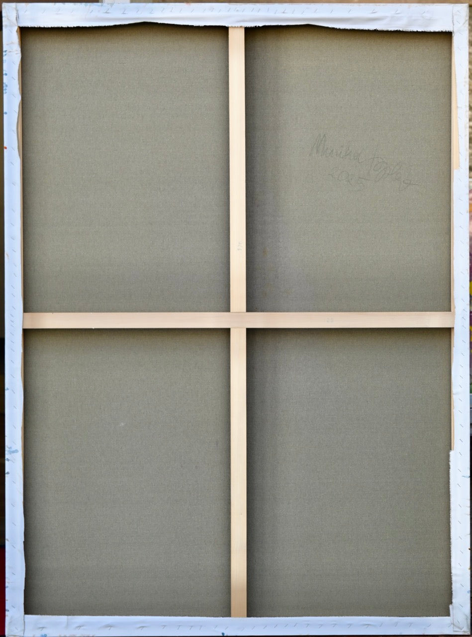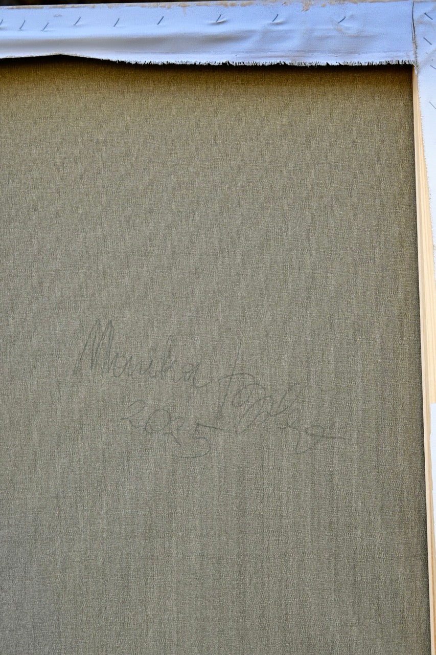 In diesem großformatigen Werk kombiniert Monika Toplev verschiedene Materialien zu einer vielschichtigen Oberflächenstruktur. Die Künstlerin trägt mit stark verdünnter Tusche flüssige Farbschichten auf, die sie in einem langsamen, beobachtenden Prozess ineinander fließen lässt. Durch gezieltes Neigen und Drehen der Leinwand beeinflusst sie den Verlauf und das Zusammenspiel der Farben. Die Oberfläche des Bildes ist geprägt von einem spannungsvollen Kontrast zwischen leuchtenden, pigmentreichen Farbbereichen und matten, erdigen Partien. Die gespachtelte Struktur zeigt feine Risse und aufgebrochene Stellen, die an Naturprozesse wie Trockenheit und Erosion erinnern.