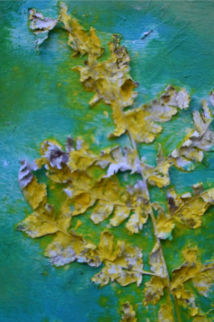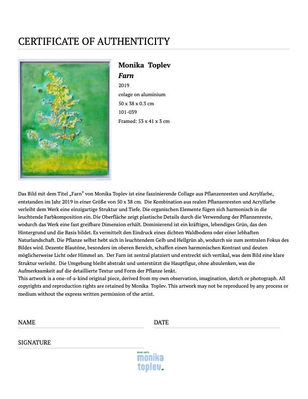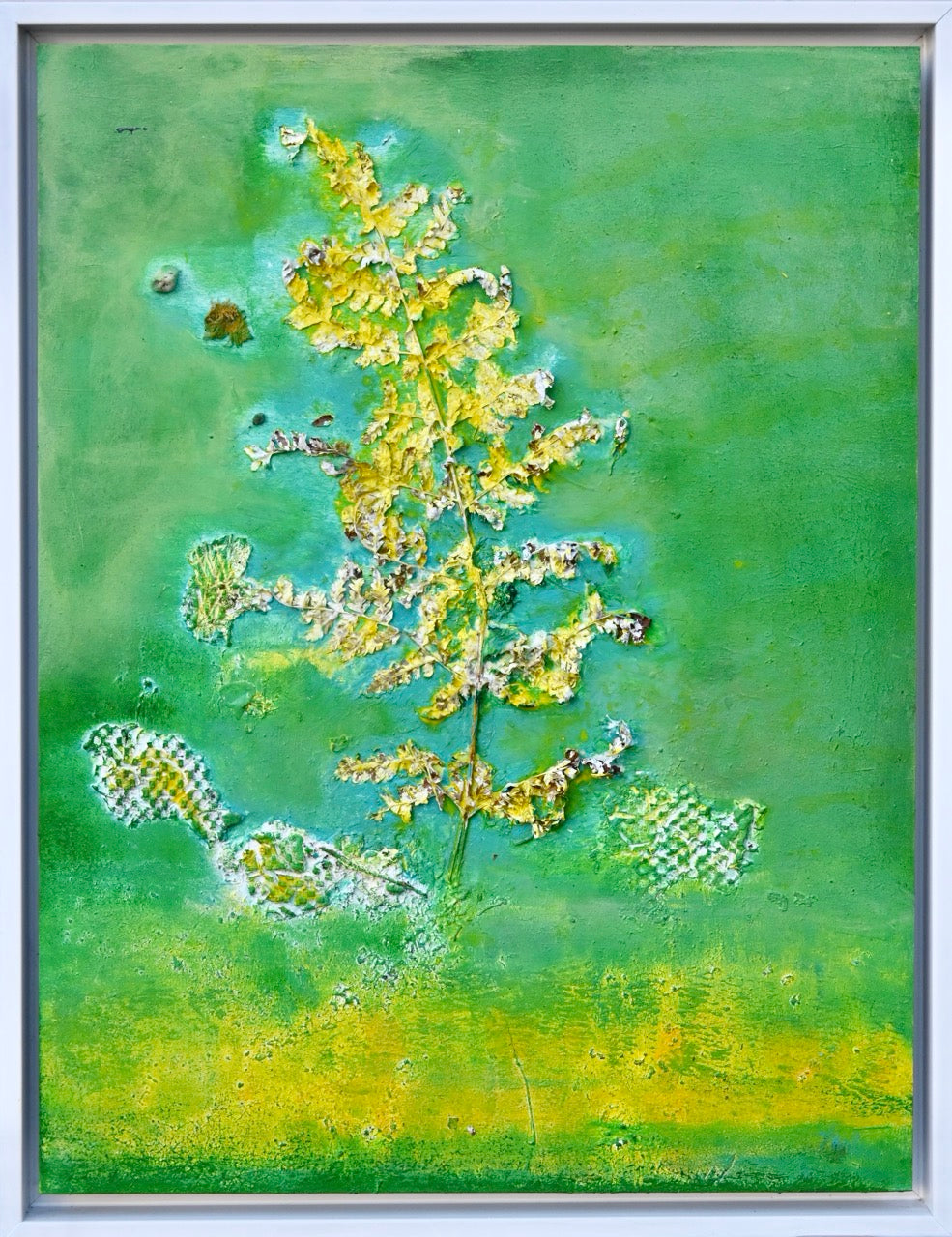 Das Bild mit dem Titel „Farn“ von Monika Toplev ist eine faszinierende Collage aus Pflanzenresten und Acrylfarbe, entstanden im Jahr 2019 in einer Größe von 50 x 38 cm.