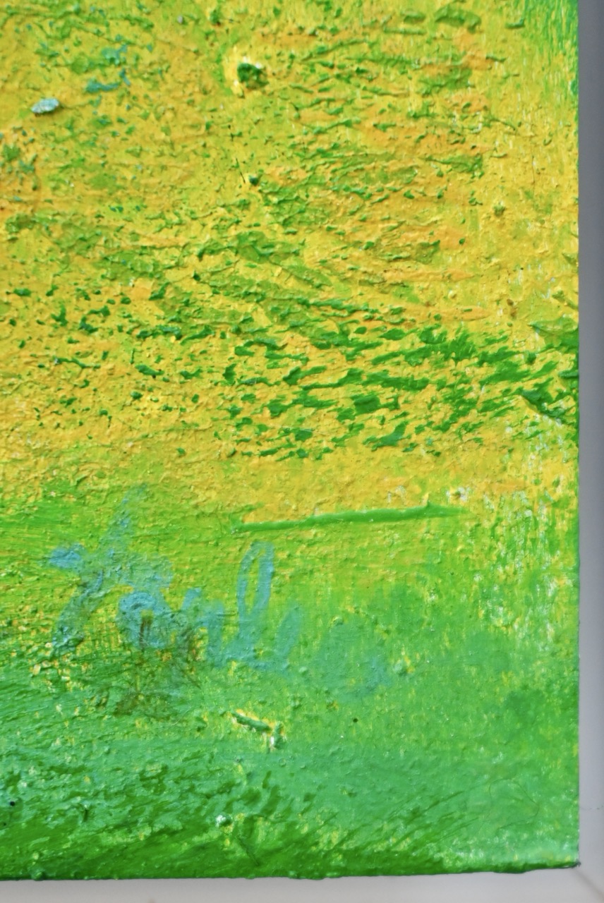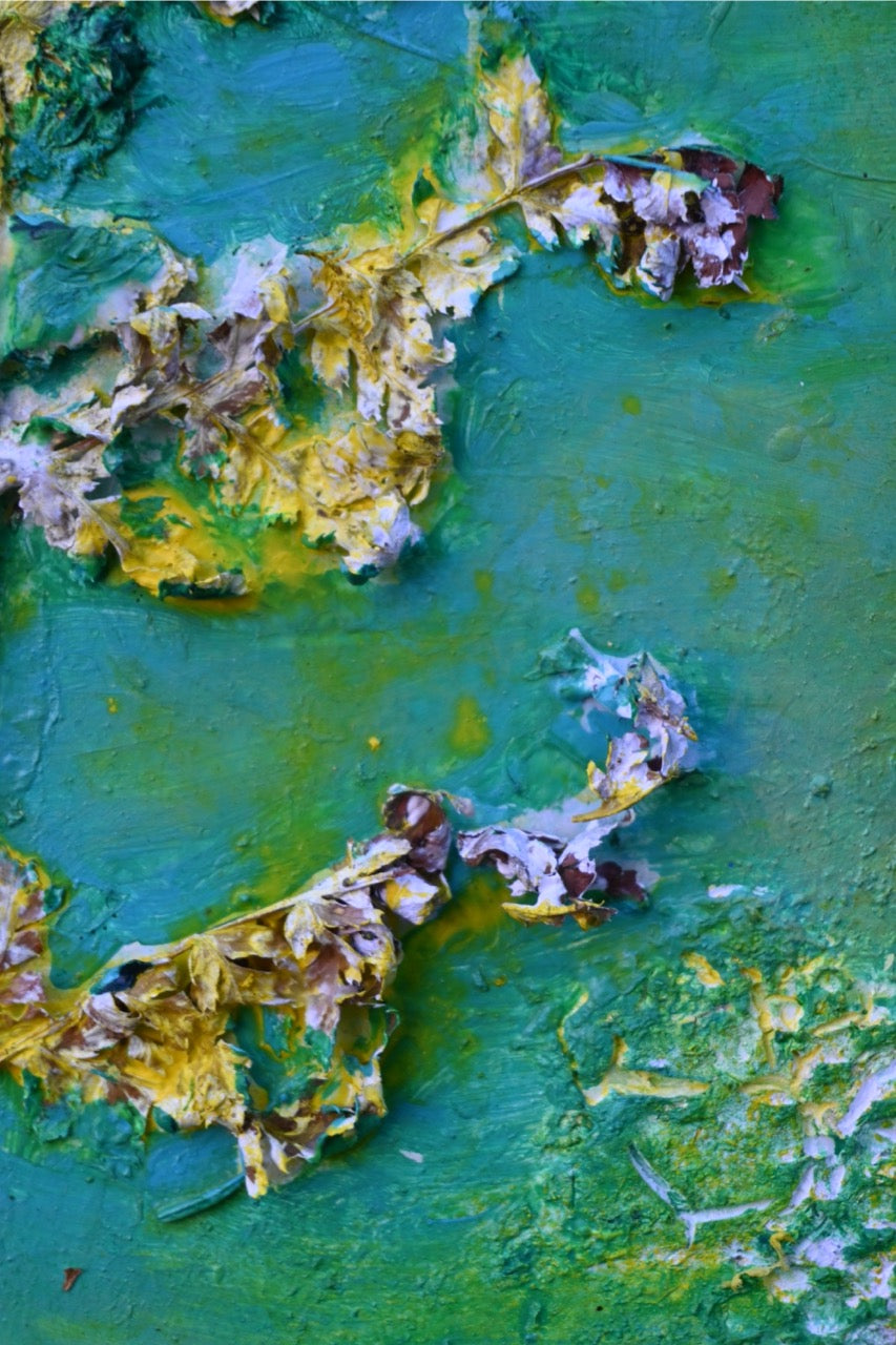 Die Kombination aus realen Pflanzenresten und Acrylfarbe verleiht dem Werk eine einzigartige Struktur und Tiefe. Die organischen Elemente fügen sich harmonisch in die leuchtende Farbkomposition ein. Die Oberfläche zeigt plastische Details durch die Verwendung der Pflanzenreste, wodurch das Werk eine fast greifbare Dimension erhält.