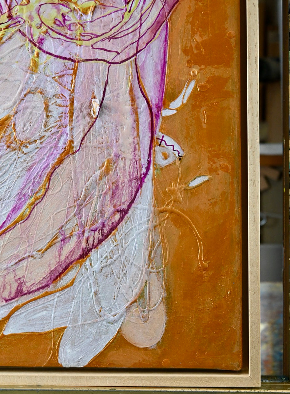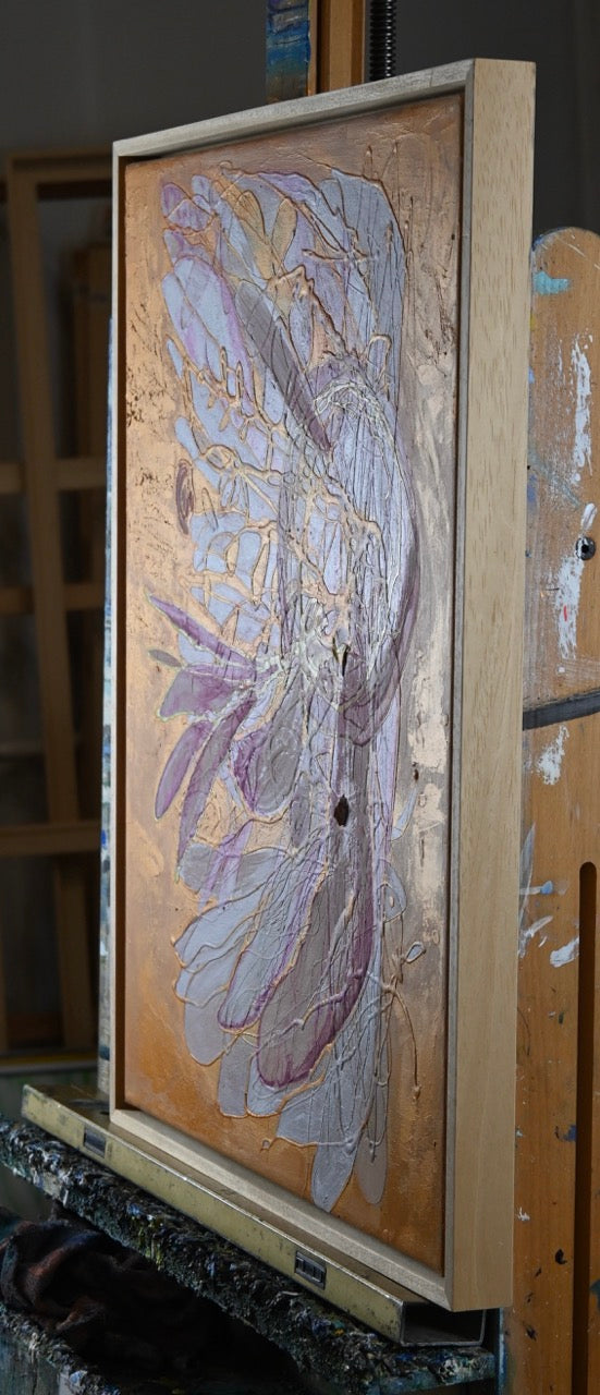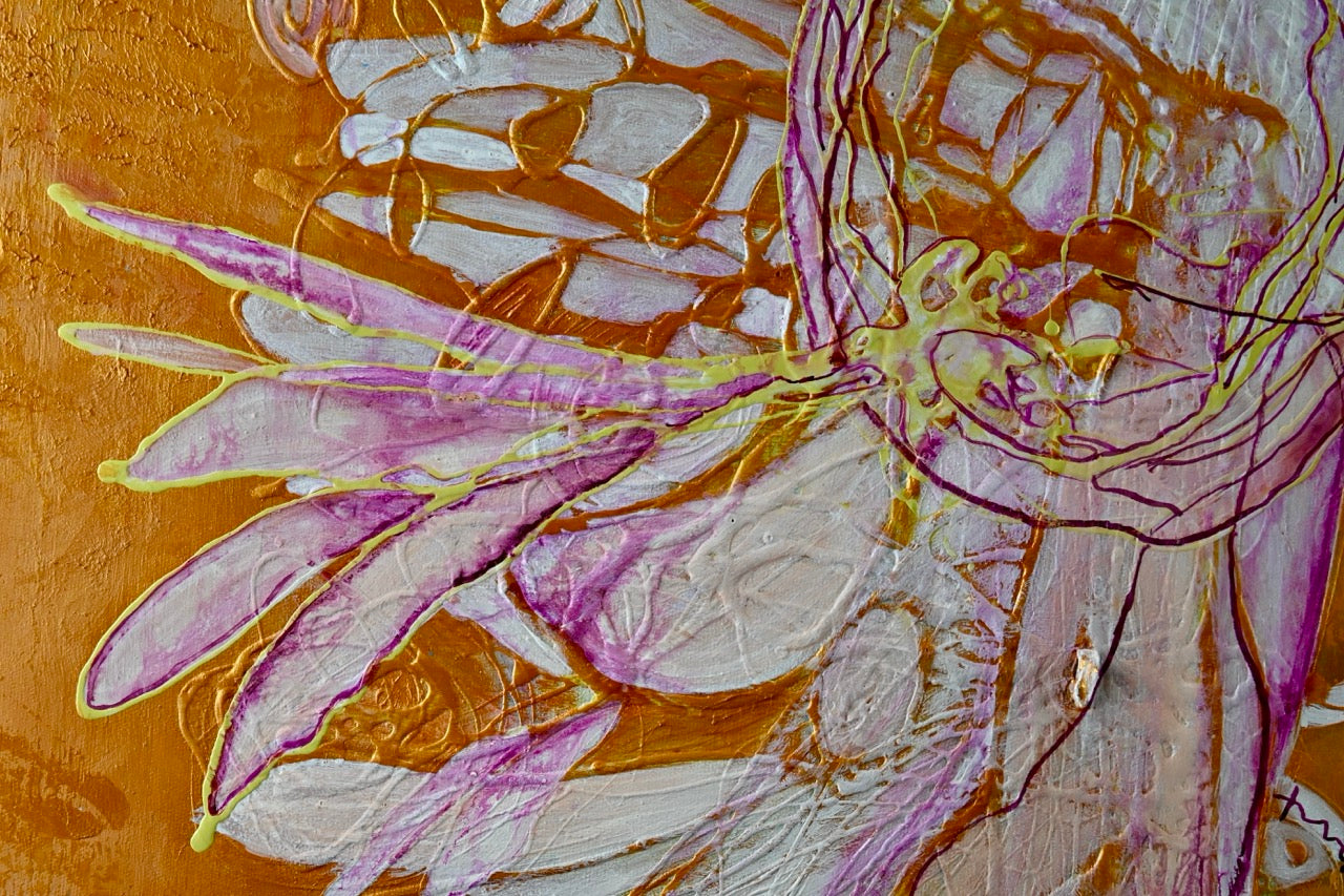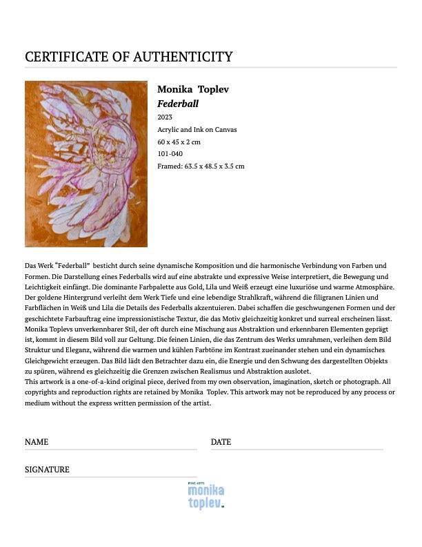 Die dominante Farbpalette aus Gold, Lila und Weiß erzeugt eine luxuriöse und warme Atmosphäre. Der goldene Hintergrund verleiht dem Werk Tiefe und eine lebendige Strahlkraft, während die filigranen Linien und Farbflächen in Weiß und Lila die Details des Federballs akzentuieren. Dabei schaffen die geschwungenen Formen und der geschichtete Farbauftrag eine impressionistische Textur, die das Motiv gleichzeitig konkret und surreal erscheinen lässt.
