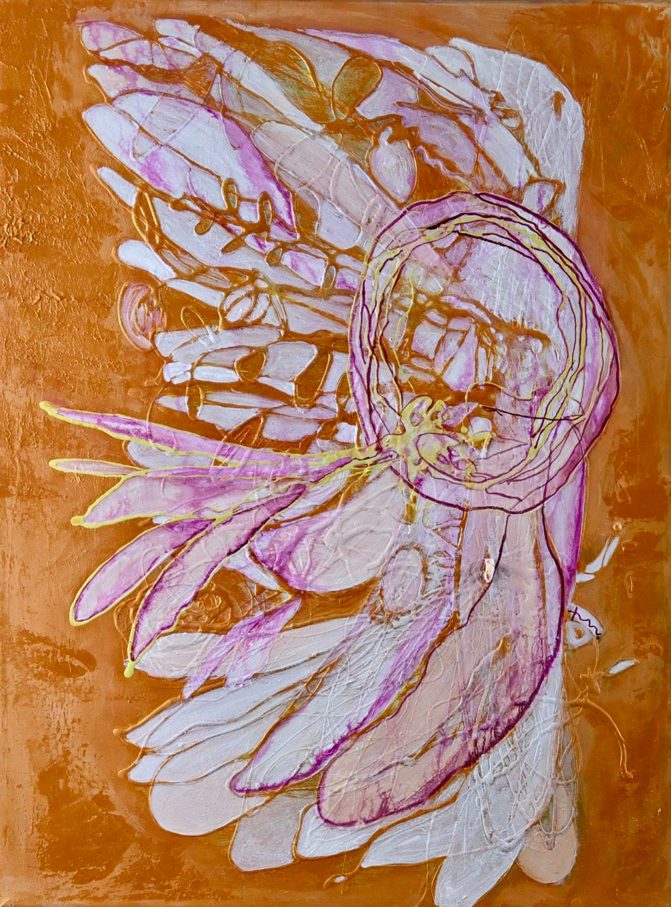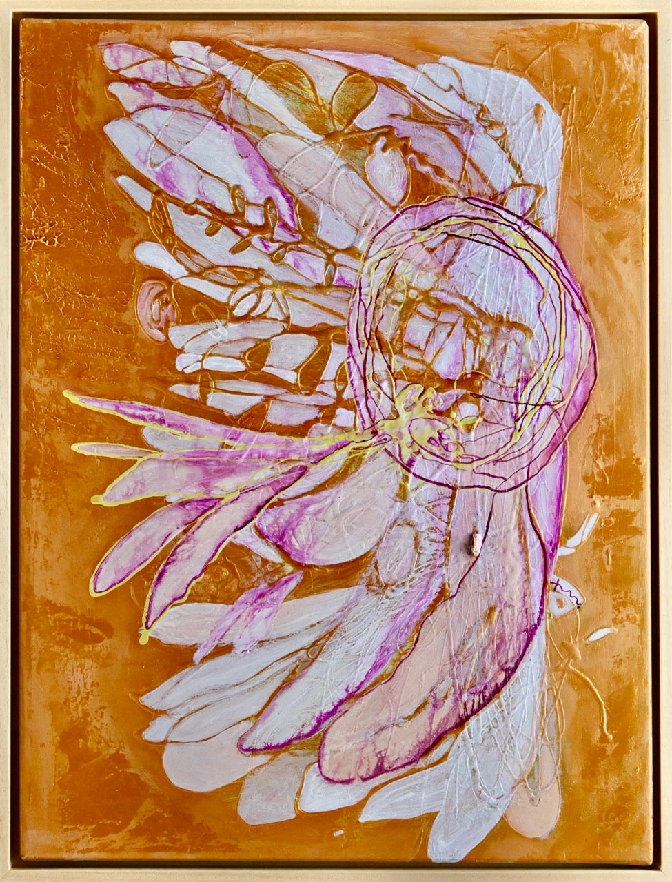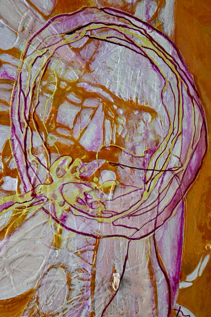 Die dominante Farbpalette aus Gold, Lila und Weiß erzeugt eine luxuriöse und warme Atmosphäre. Der goldene Hintergrund verleiht dem Werk Tiefe und eine lebendige Strahlkraft, während die filigranen Linien und Farbflächen in Weiß und Lila die Details des Federballs akzentuieren. Dabei schaffen die geschwungenen Formen und der geschichtete Farbauftrag eine impressionistische Textur, die das Motiv gleichzeitig konkret und surreal erscheinen lässt.