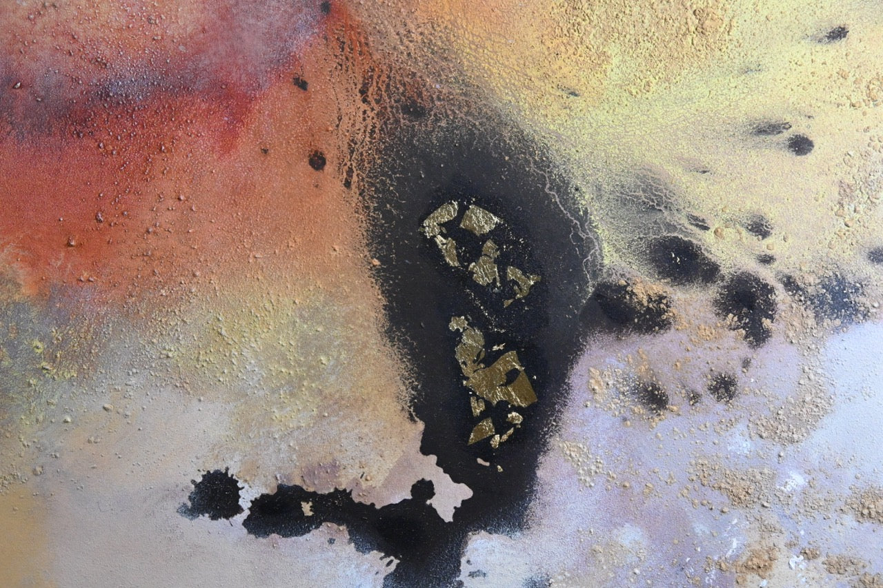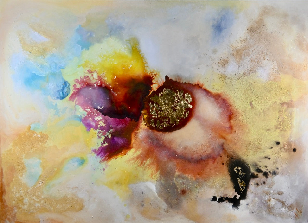 Das Bild ist eine abstrakte Komposition von Farben und Formen, die an einen Nebel oder eine Galaxie erinnern könnten. Die dominierenden Farben sind warme Erdtöne wie Beige, Gold, Braun und Rot, die mit kälteren Blau- und Lilatönen kontrastieren. Im Zentrum des Bildes befindet sich eine markante, fast kreisförmige Form, die mit Blattgold akzentuiert ist und wie eine Sonne oder ein Stern aussieht, von dem aus sich verschiedene Farbnebel in alle Richtungen ausbreiten. Diese Farbnebel sind nicht scharf abgegrenzt, sondern verlaufen weich ineinander über, was einen flüchtigen und dynamischen Eindruck erzeugt. Es gibt auch kleinere, dunkle, fast schwarze Flecken, die wie Sternstaub oder kleine kosmische Partikel wirken. Die Textur des Bildes ist uneben; man kann eine gewisse Rauigkeit und eine gewisse Tiefe in der Farbgebung erkennen. Die Gesamtatmosphäre ist sowohl kraftvoll als auch ruhig, geheimnisvoll und gleichzeitig beruhigend. Das Bild vermittelt ein Gefühl von Bewegung und Energie, aber auch von innerer Ruhe und Harmonie. Es gibt keine erkennbaren Objekte oder Figuren wie Personen oder Tiere; die gesamte Komposition ist rein abstrakt und konzentriert sich auf die Wirkung von Farbe und Form.