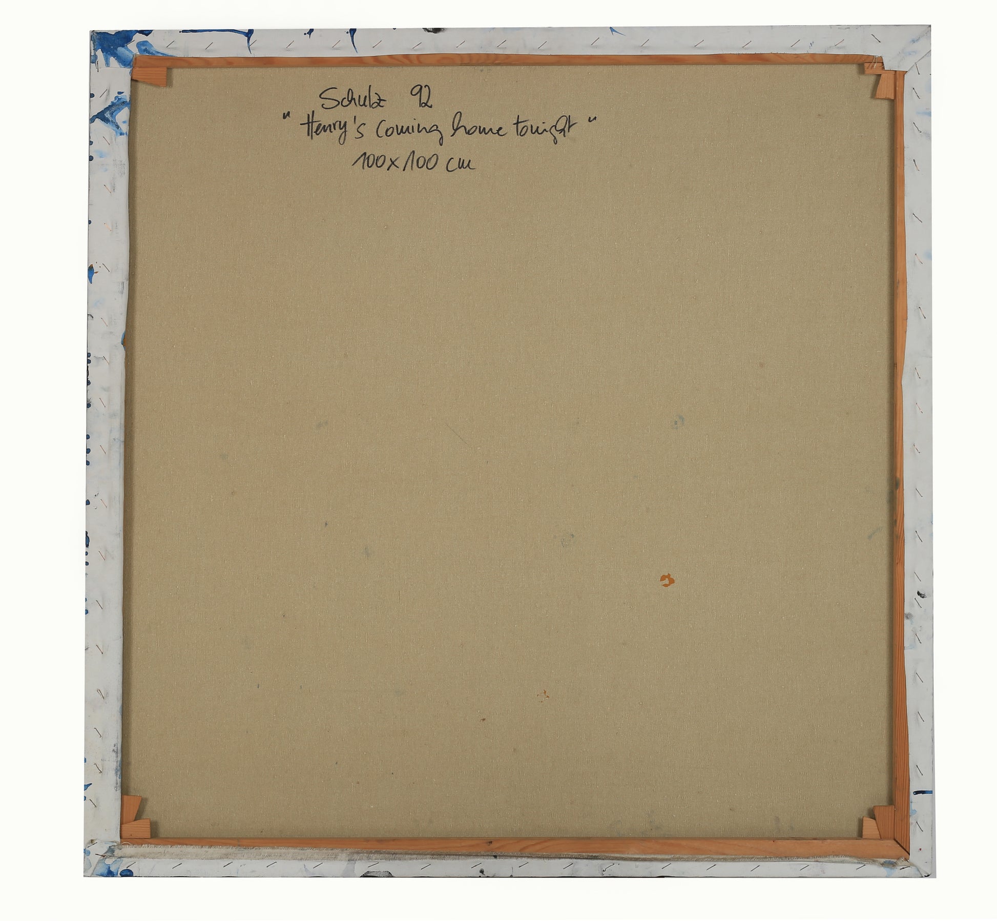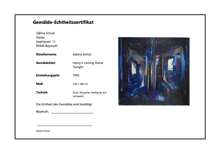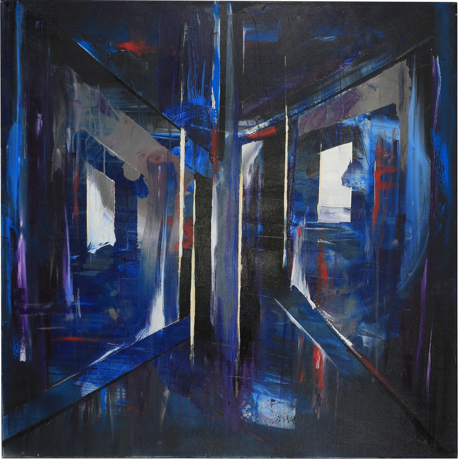 Das Gemälde ist eine abstrakte Komposition eines nächtlichen Raumes, dominiert von dunklen Violet,- und Blautönen, die eine geheimnisvolle und nachdenkliche Atmosphäre erzeugen.