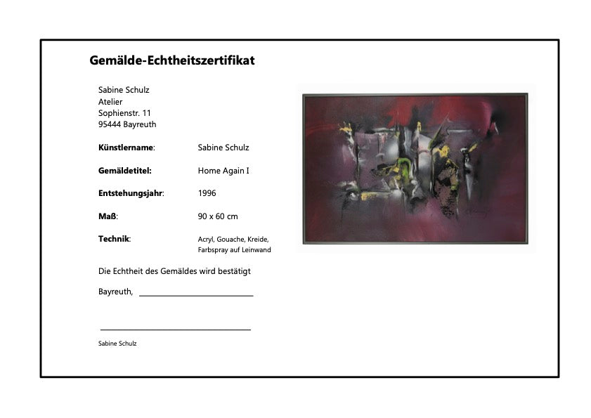 Der Titel Home Again I öffnet eine symbolische Ebene: Die Rückkehr – sei es zu einem Ort, zu sich selbst oder in ein inneres Gefühl von Heimat – scheint hier nicht konkret dargestellt, sondern atmosphärisch greifbar gemacht. Das Werk bleibt in seiner Formensprache offen, doch seine Wirkung ist klar: Es vermittelt Intimität, Tiefe und eine stille Reflexion über das Ankommen.