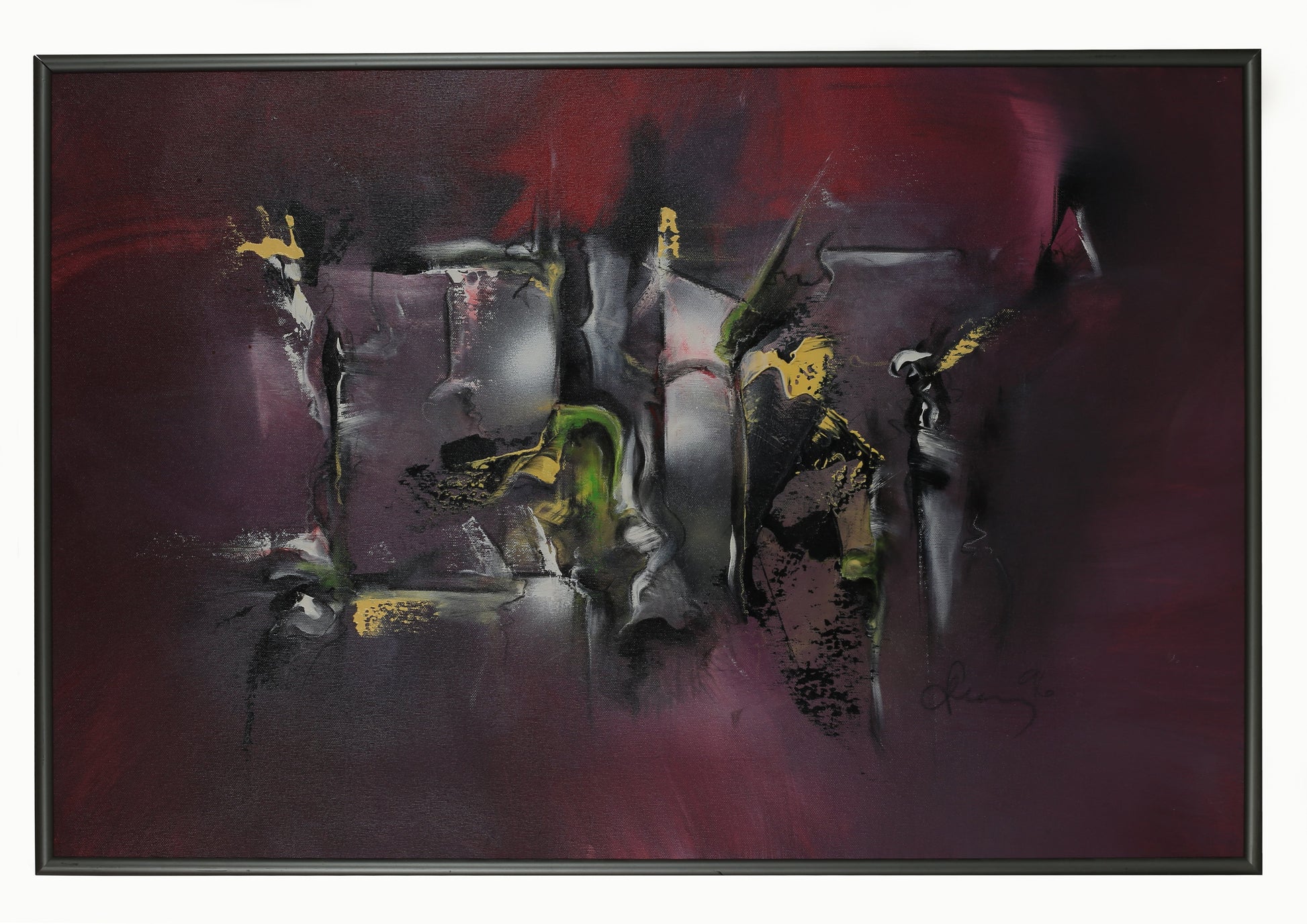 Die zentrale Bildfläche wird durch Formen in Violett, Schwarz und Grau strukturiert, durchzogen von Impulsen in leuchtendem Gelb, Grün und Weiß. Diese farblichen Kontraste erzeugen Spannung und Bewegung, wirken gleichzeitig wie Erinnerungsfragmente oder emotionale Spuren. Die fließenden Übergänge und scharf gesetzten Akzente lassen den Blick unaufhörlich wandern, ohne je ganz zur Ruhe zu kommen.