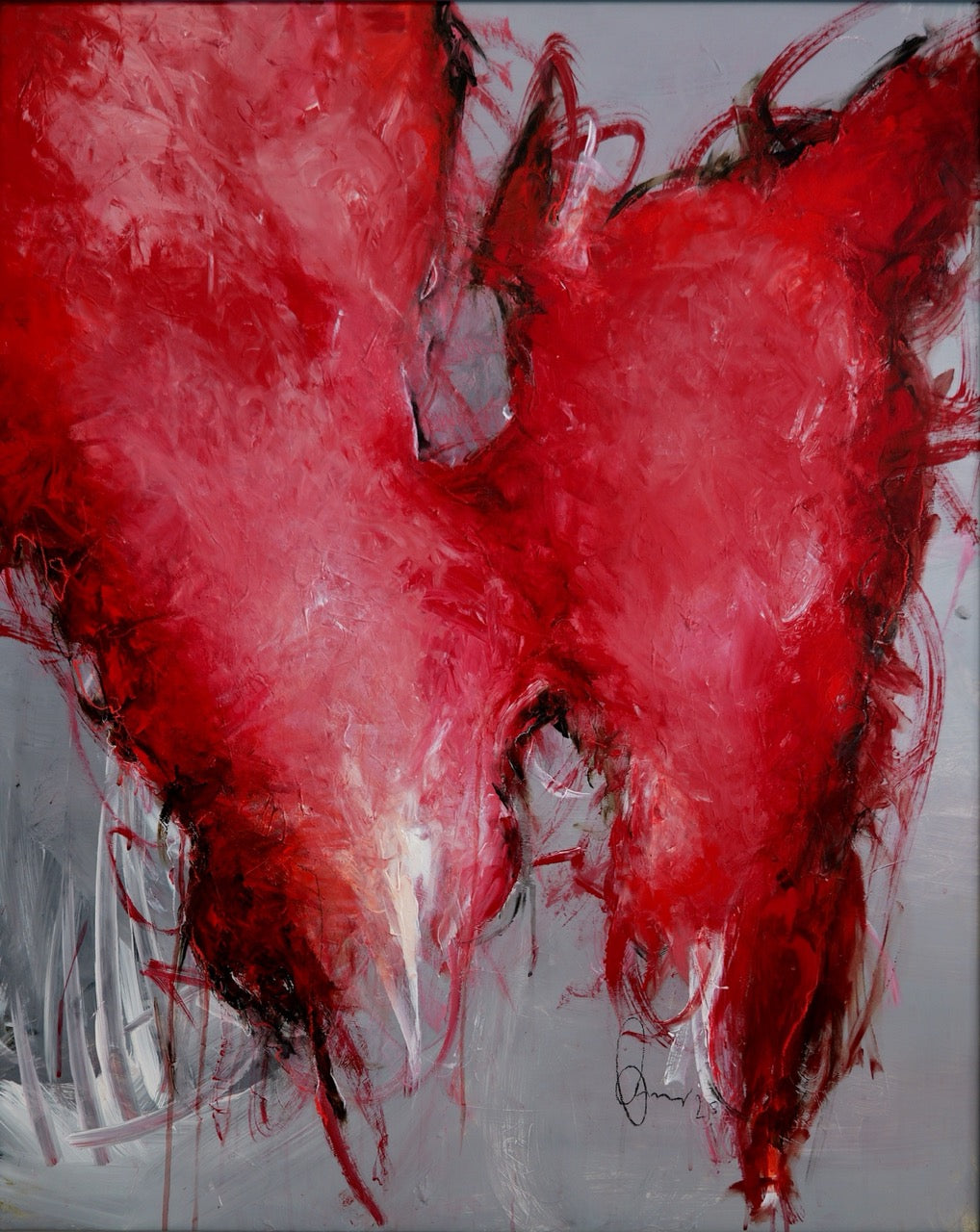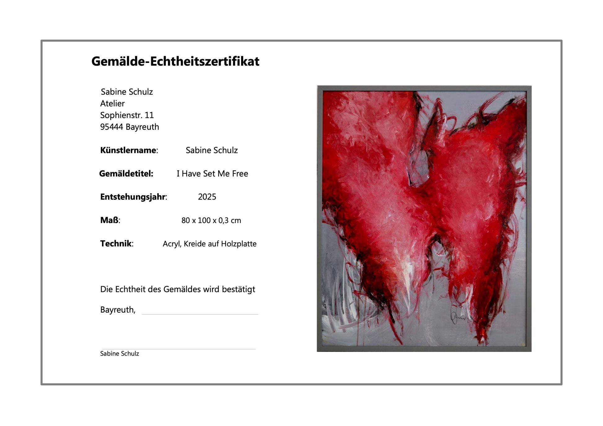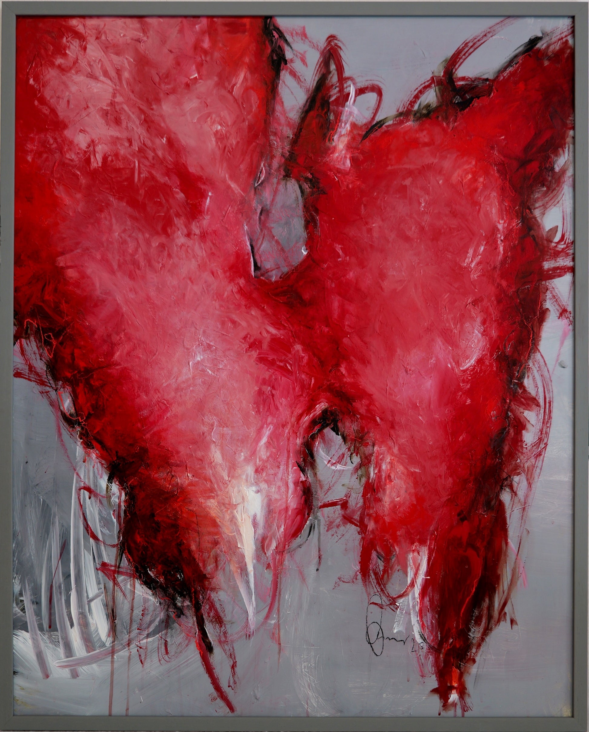 Das Gemälde „I Have Set Me Free“ ist eine kraftvolle, emotional aufgeladene Komposition, die mit expressiver Farbwahl und gestischer Energie ein eindrucksvolles Bild innerer Befreiung erschafft. Die Leinwand wird dominiert von zwei großflächigen, flammend roten Formen, die sich – wie ein aufbrechender Körper oder sich entfaltende Flügel – vom hellen, grauen Hintergrund abheben. Die Farbflächen scheinen miteinander verbunden und zugleich gegeneinander gespannt zu sein, als würde eine Energie aus ihrem Inneren nach außen drängen.