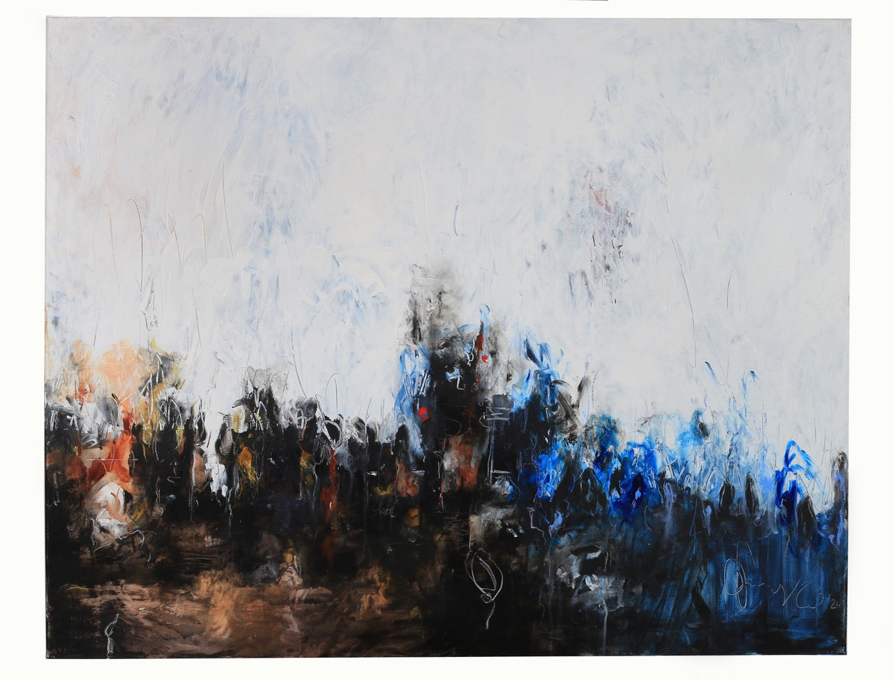Die obere Hälfte des Gemäldes ist von kraftvollen weißen Pinselstrichen durchzogen, unter denen sich zarte Schichten aus Blau und Rot verbergen – wie vergessene Gedanken unter der Oberfläche. Dieser Bereich wirkt zugleich unruhig und beruhigend, ein visuelles Atmen zwischen Spannung und Stille.