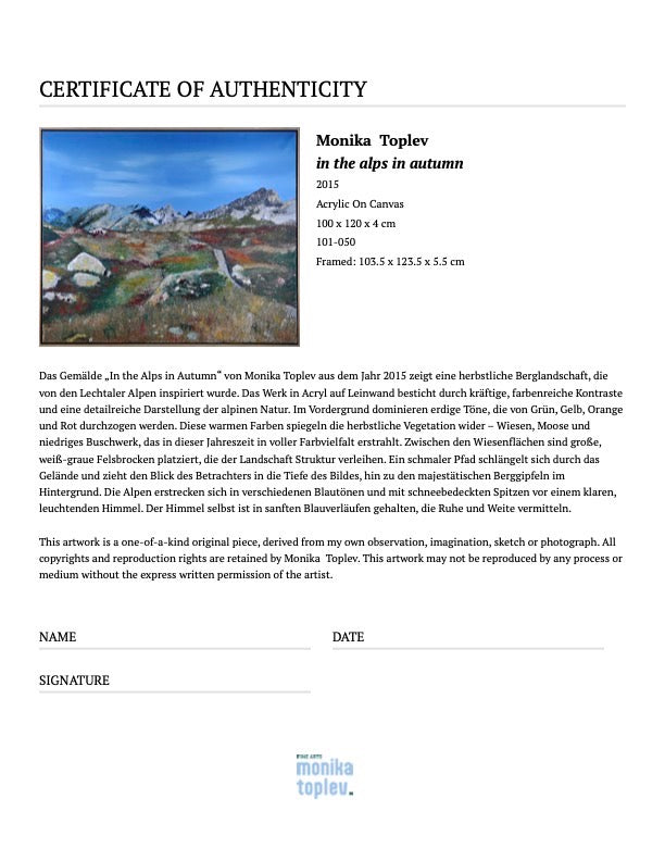 Das Gemälde „in the alps in autumn“ von Monika Toplev aus dem Jahr 2015 zeigt eine herbstliche Berglandschaft, die von den Lechtaler Alpen inspiriert wurde. Das Werk in Acryl auf Leinwand besticht durch kräftige, farbenreiche Kontraste und eine detailreiche Darstellung der alpinen Natur.