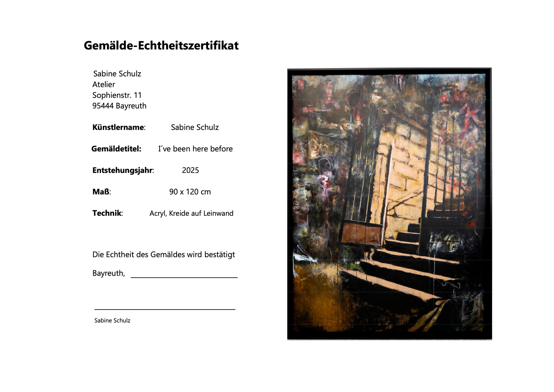 Der Titel „I’ve been here before“ öffnet die Assoziation zu Déjà-vu-Erfahrungen, zu Orten, die in der Erinnerung nachhallen, ohne klar verortet werden zu können. Der Betrachter wird eingeladen, das Bild nicht nur als architektonische Szenerie, sondern als inneren Raum der Wieder,- oder Heimkehr zu sehen – ein Zwischenraum, in dem Vergangenheit und Gegenwart, Angst, Hoffnung oder Neuanfang aufeinandertreffen.