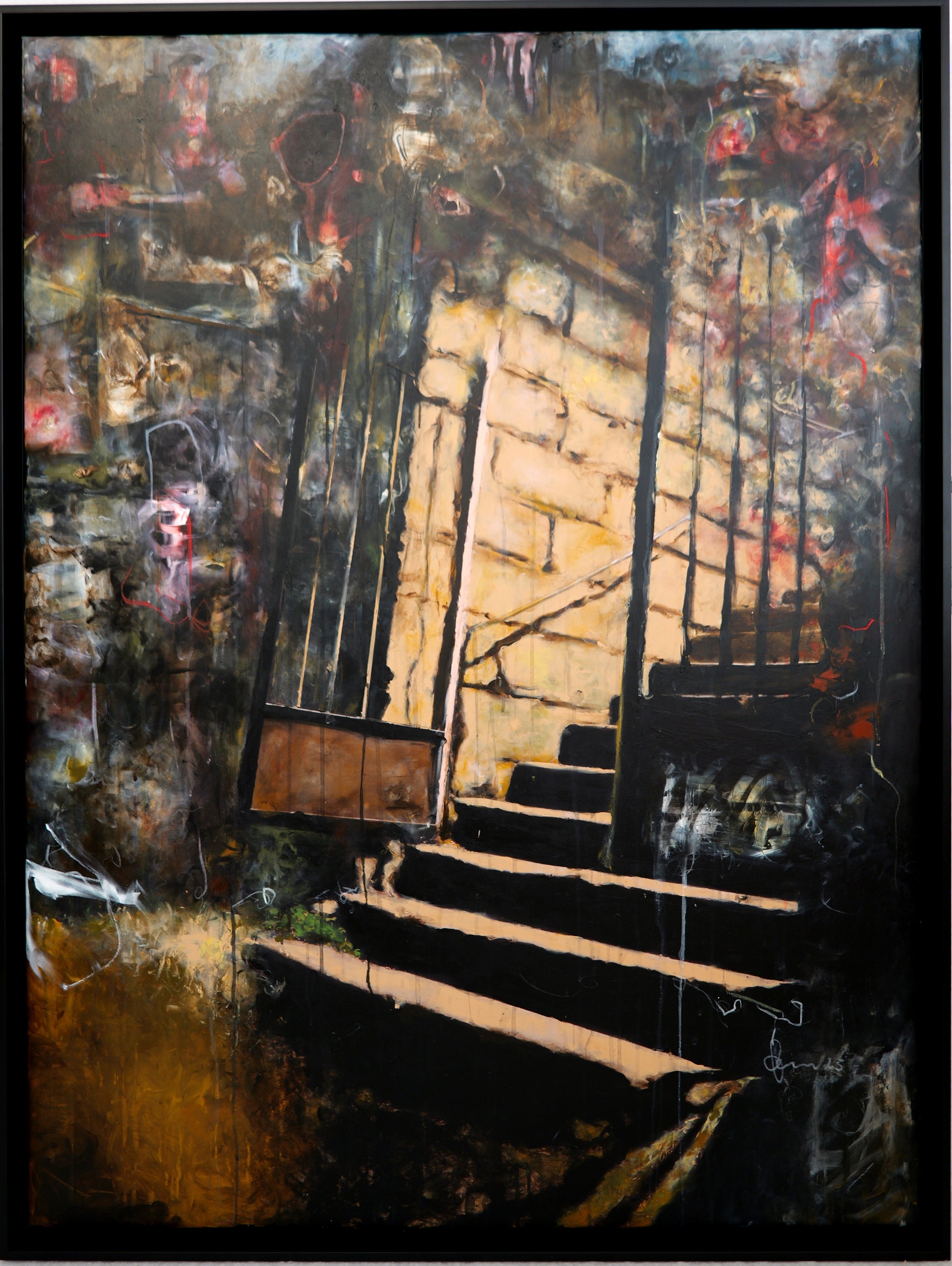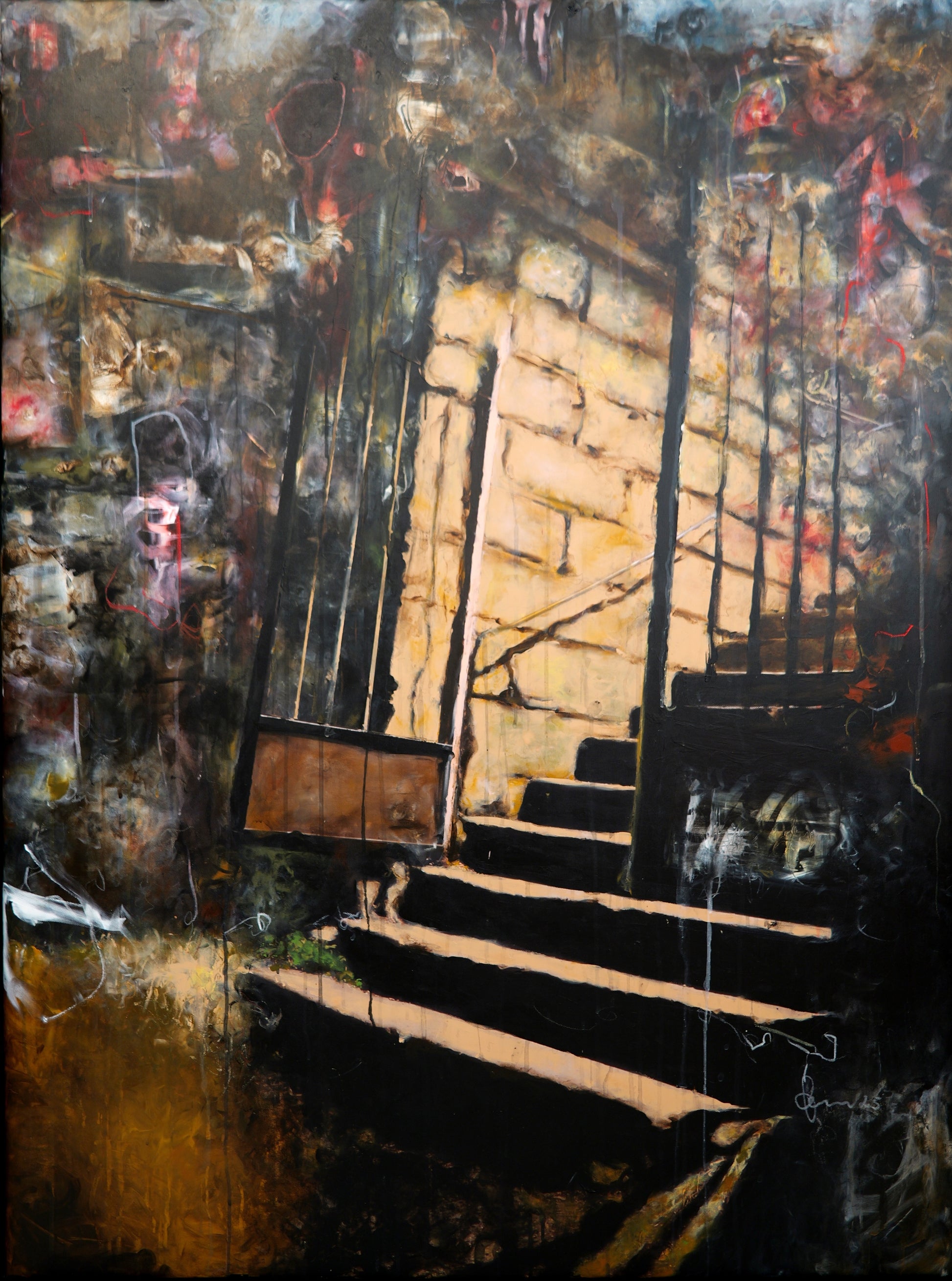Die umgebenden Farbschichten, getragen von erdigen Brauntönen, Schwarz und eruptiven Rottönen, verleihen dem Werk eine archaische Tiefe. Sie wirken wie Spuren von Erinnerung, fragmentierte Emotionen, die sich in die Mauer und den Weg hineingeschrieben haben.