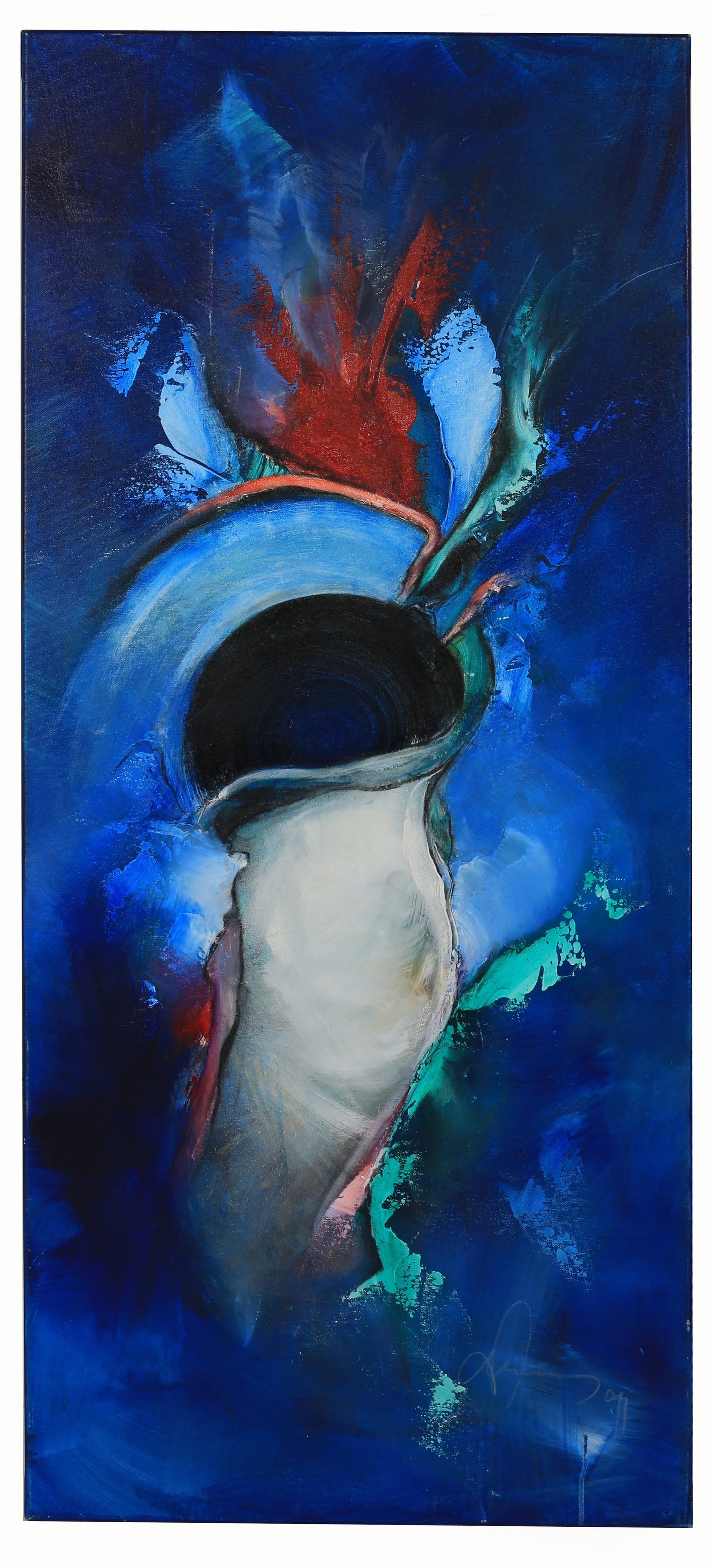 Aus diesem vielschichtigen Grund erhebt sich ein zentrales Gebilde. Es erinnert an eine Vase oder an eine Blüte, die sich nach oben öffnet. In ihrem Zentrum liegt ein dunkler, schwar-blauer Raum. Er wirkt wie ein inneres Auge oder eine Öffnung, die nicht verschlingt, sondern anzieht. Eine Stille, die Kraft ausstrahlt. Dieser Mittelpunkt scheint alles auf sich zu richten – nicht als Bedrohung, sondern als Einladung. Eine Tiefe, in der sich etwas sammelt, konzentriert, verdichtet. Ein Zentrum der Ruhe im Tanz der Farben.