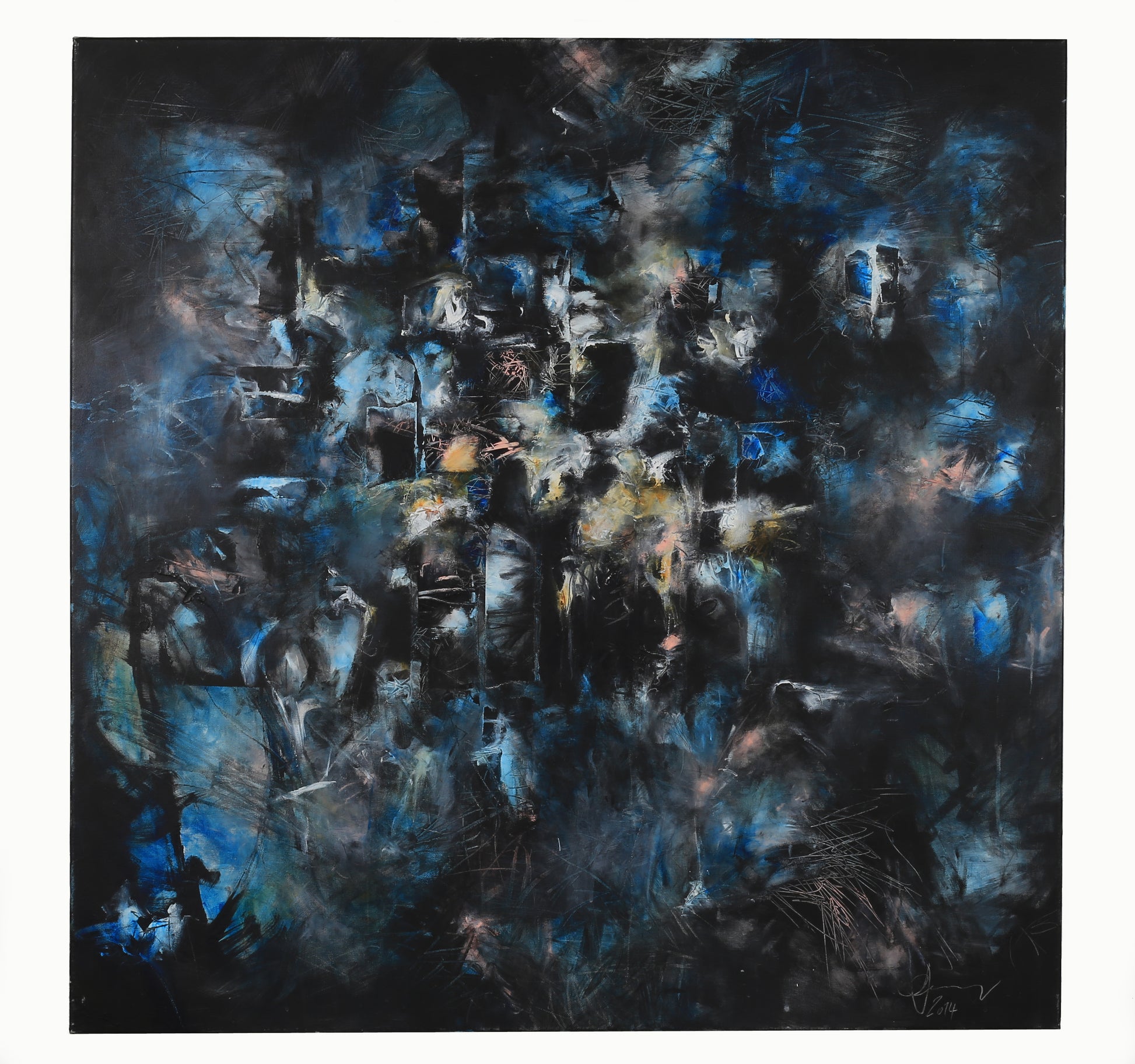 Das Bild ist eine abstrakte Komposition, die keine erkennbaren Objekte oder Figuren im traditionellen Sinne zeigt. Die gesamte Fläche ist mit einer dichten, vielschichtigen Farbschicht bedeckt. Dominierend sind tiefe Blautöne in verschiedenen Schattierungen, vermischt mit Schwarz und gelegentlichen Akzenten von Grau, Weiß und sanften Rosa- und Ockertönen. Die Farben sind nicht gleichmäßig verteilt, sondern bilden dynamische, fast turbulente Muster. Die Pinselstriche sind expressiv und teilweise pastos aufgetragen; einige Bereiche wirken fast wie Kratzspuren oder Zeichnungen über der Farbschicht. Es gibt keine klar definierten Formen oder Linien, sondern eher ein komplexes Geflecht von Farbflächen und -strukturen, die sich überlagern und ineinander verschwimmen.