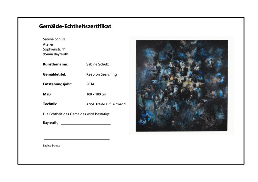 Das Gemälde zeigt eine abstrakte, dunkle und geheimnisvolle Szene, die durch dynamische Pinselstriche und eine dominierende Blau- und Schwarzpalette gekennzeichnet ist.