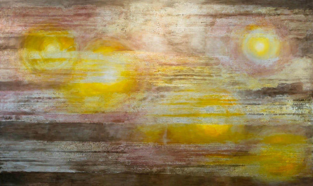 Das Bild zeigt eine abstrakte Komposition, die stark von leuchtenden Gelb- und Goldtönen dominiert wird, eingebettet in eine Palette von erdigen Brauntönen und zarten Rosé- und Graunuancen. Die zentralen Elemente sind mehrere kreisförmige Formen, die wie leuchtende Sonnen oder ferne Galaxien erscheinen. Sie strahlen ein intensives Licht aus, das sich in weichen, verschwimmenden Übergängen in die umliegenden Farbflächen ausbreitet.