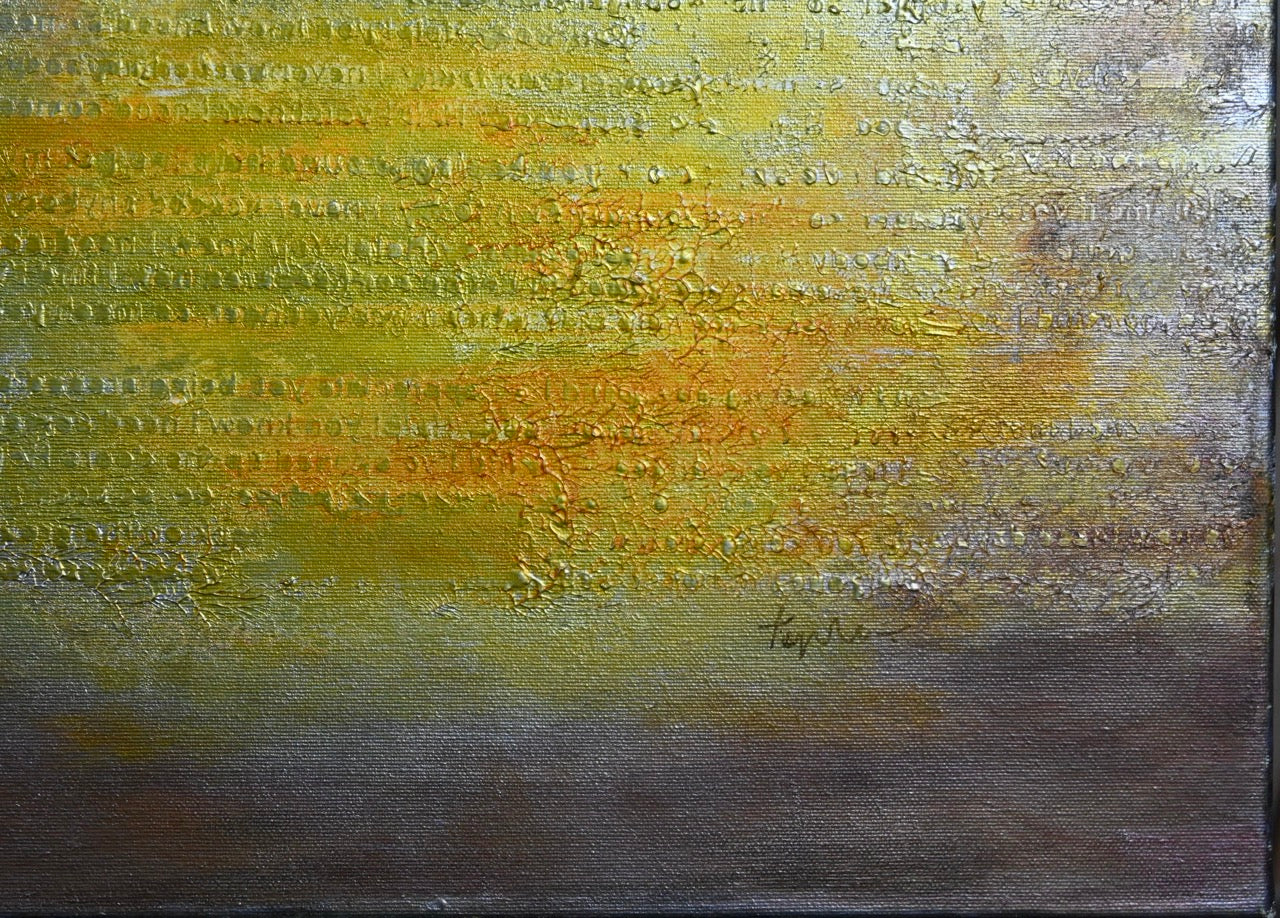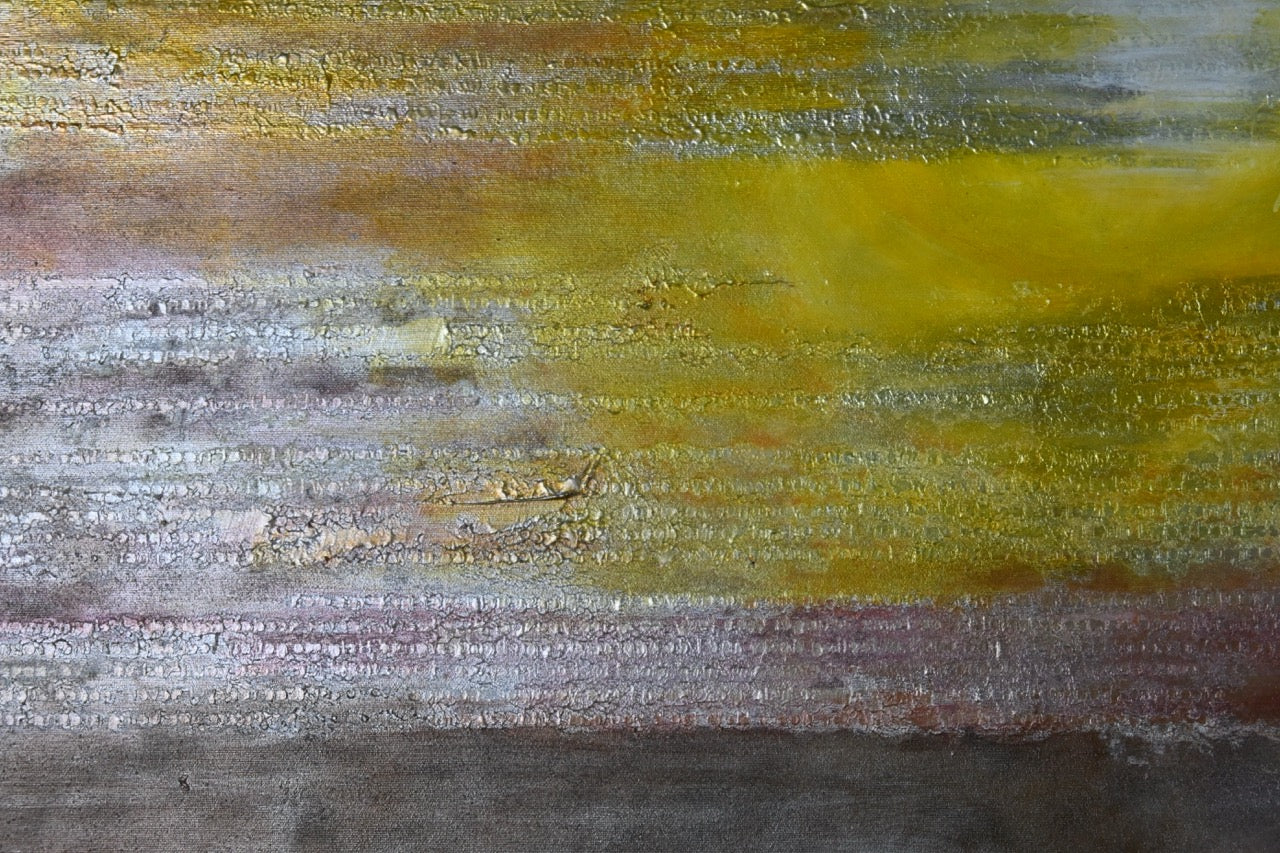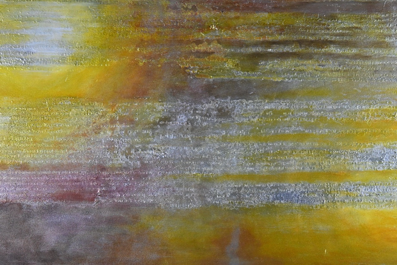 Die horizontale Struktur des Gemäldes wird durch viele Schichten von Farbe und Textur betont, die wie Horizonte oder Nebelbänder wirken. Die Oberfläche scheint durch die Tinte und Acrylfarbe eine gewisse Tiefe und Haptik zu besitzen, was dem Bild eine fast greifbare Dimension verleiht. Das Licht scheint durch die unregelmäßigen Schichten hindurchzubrechen, was dem Werk eine lebendige und fast mystische Wirkung verleiht.