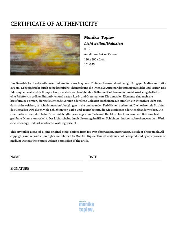 Das Gemälde Lichtwelten/Galaxien von Monika Toplev, geschaffen im Jahr 2019, ist ein Werk aus Acryl und Tinte auf Leinwand mit den großzügigen Maßen von 120 x 200 cm. Es beeindruckt durch seine kosmische Thematik und die intensive Auseinandersetzung mit Licht und Textur.
