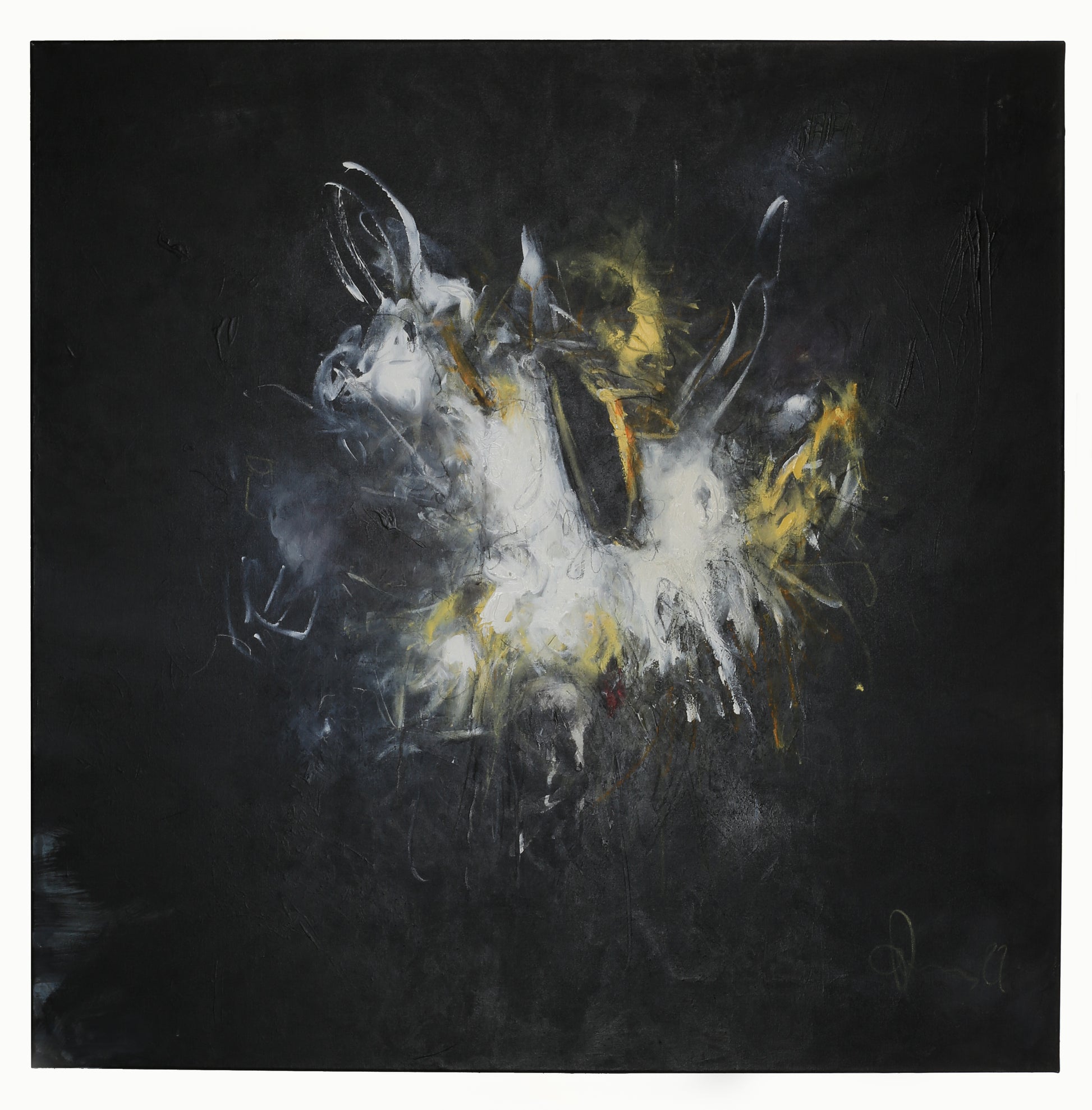 Die dunkle Fläche gibt kaum Halt. Sie umschließt das Bild, lässt das Zentrum wie eine Explosion wirken – doch es ist keine Zerstörung, eher ein Moment der Entladung, vielleicht der Geburt. Weiß, Gelb, Spuren von Rot und Grau durchbrechen das Schwarz mit einer Art flüchtiger Klarheit. Die Formen sind organisch, scharf und gleichzeitig verwaschen, als würden sie entstehen und vergehen im selben Moment.