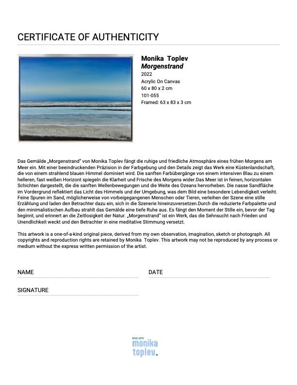 Durch die reduzierte Farbpalette und den minimalistischen Aufbau strahlt das Gemälde eine tiefe Ruhe aus. Es fängt den Moment der Stille ein, bevor der Tag beginnt, und erinnert an die Zeitlosigkeit der Natur. „Morgenstrand“ ist ein Werk, das die Sehnsucht nach Frieden und Unendlichkeit weckt und den Betrachter in eine meditative Stimmung versetzt.