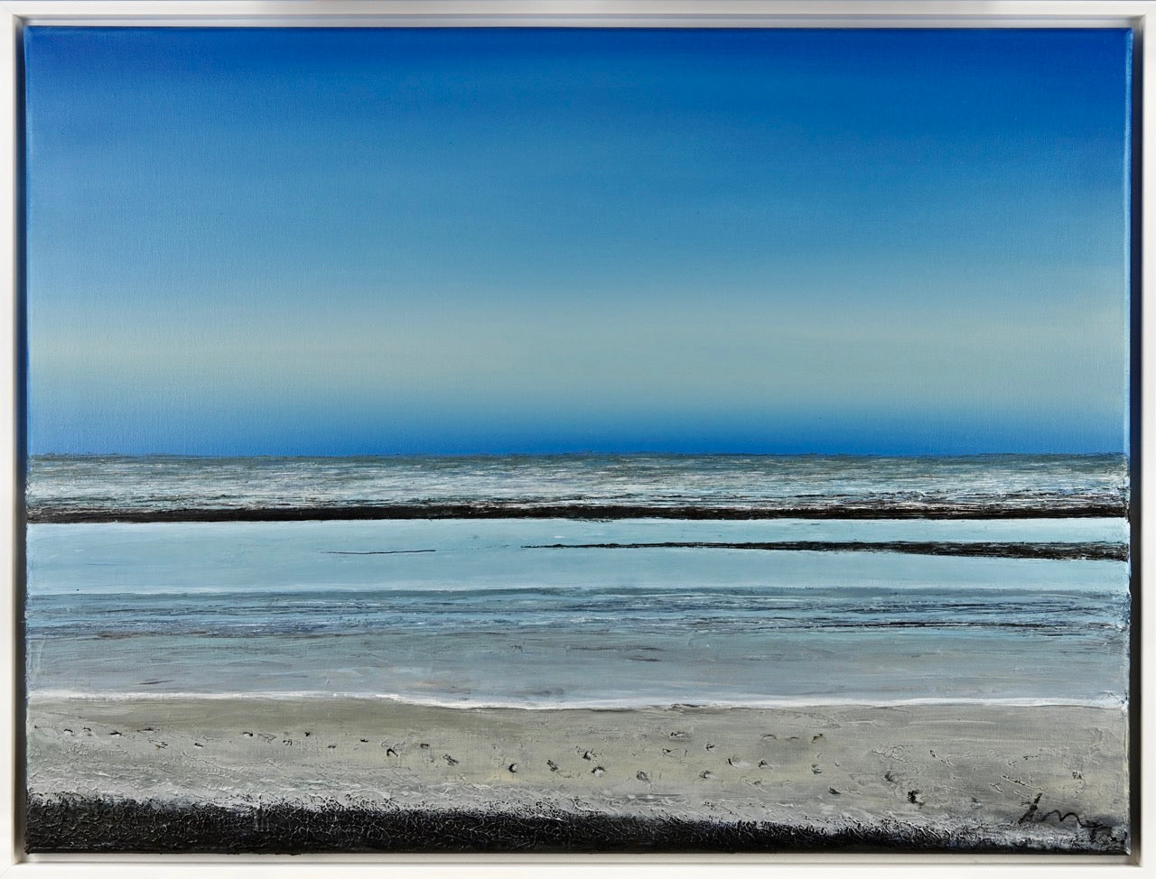 Das Meer ist in feinen, horizontalen Schichten dargestellt, die die sanften Wellenbewegungen und die Weite des Ozeans hervorheben. Die nasse Sandfläche im Vordergrund reflektiert das Licht des Himmels und der Umgebung, was dem Bild eine besondere Lebendigkeit verleiht. Feine Spuren im Sand, möglicherweise von vorbeigegangenen Menschen oder Tieren, verleihen der Szene eine stille Erzählung und laden den Betrachter dazu ein, sich in die Szenerie hineinzuversetzen.